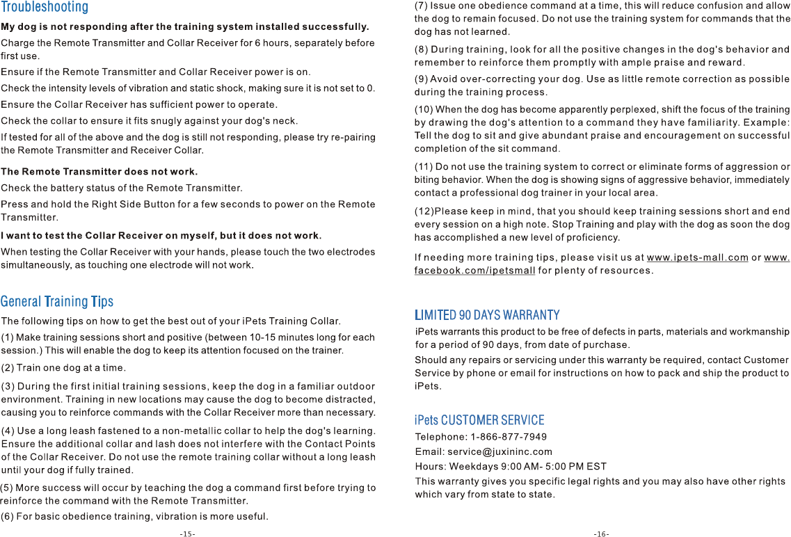 JIAYIYANG ELECTRONICS 201507-618 Remote Pet Training Collar for Multi-Dogs User Manual