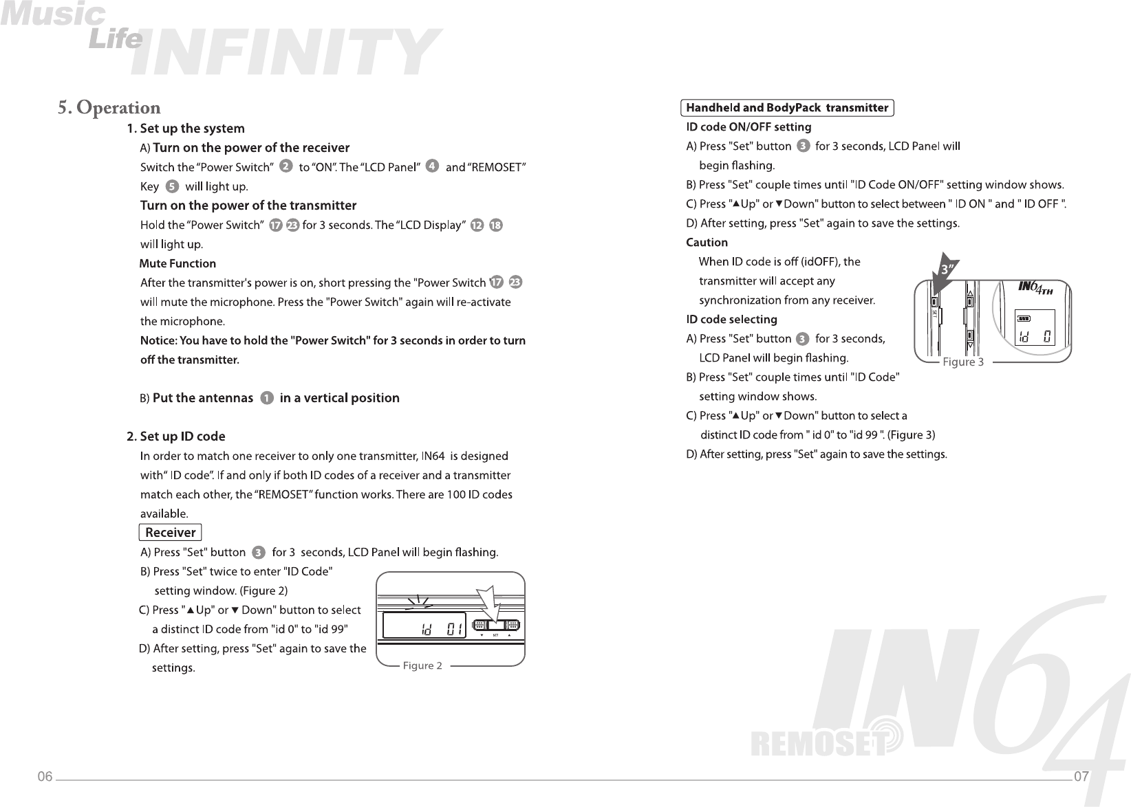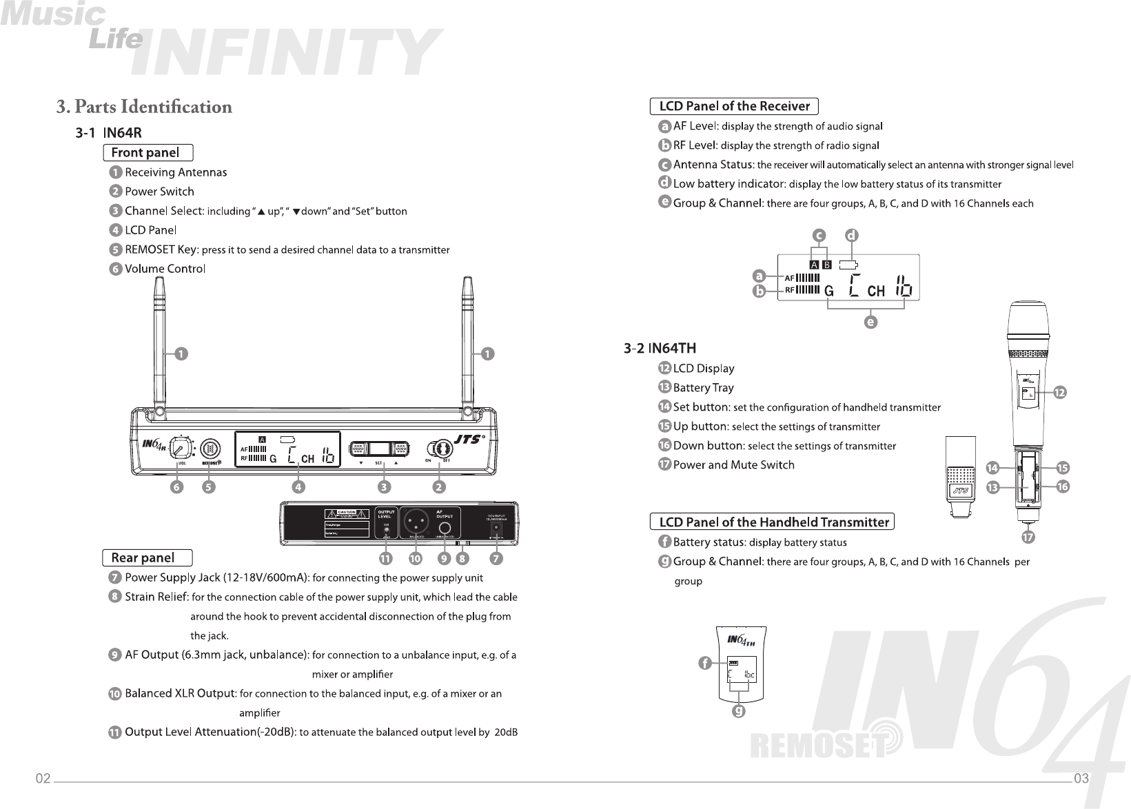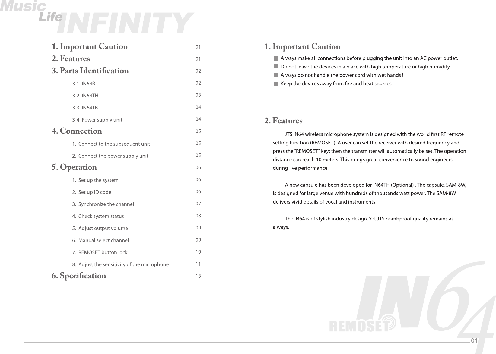 JTS PROFESSIONAL IN64TH UHF PLL single channel diversity wireless system User Manual IN 64 01