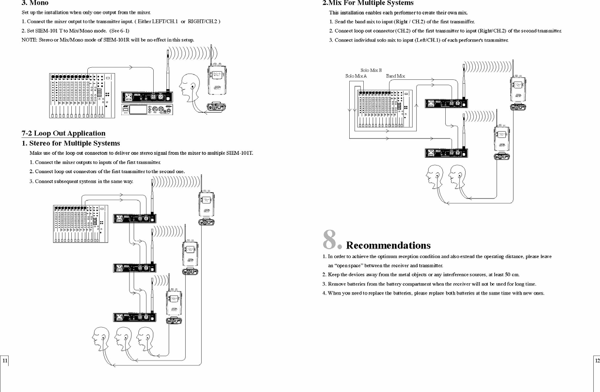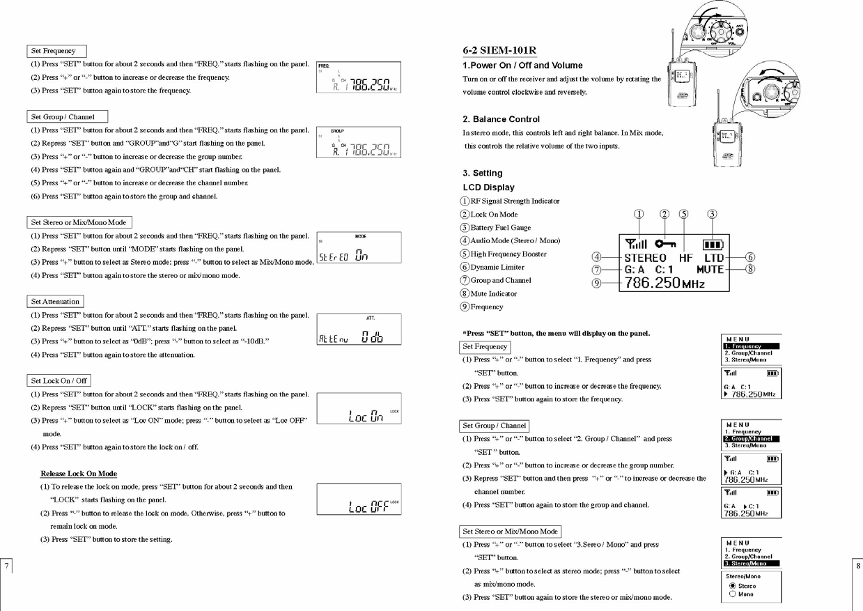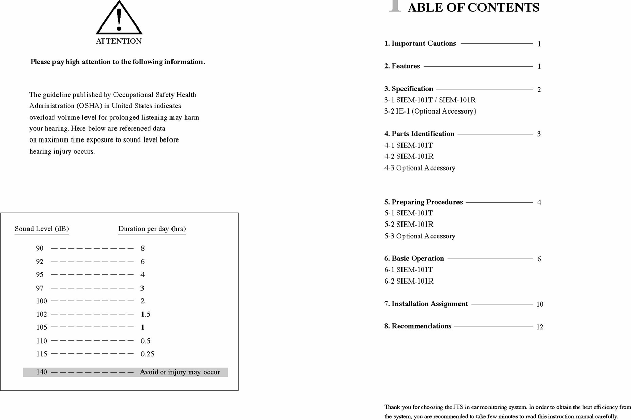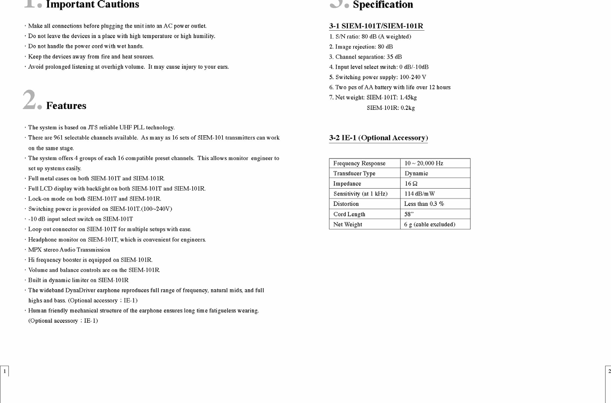 JTS PROFESSIONAL SIEM-101T UHF PLL STEREO/ MONO IN EAR MONITORING SYSTEM User Manual SIEM 101
