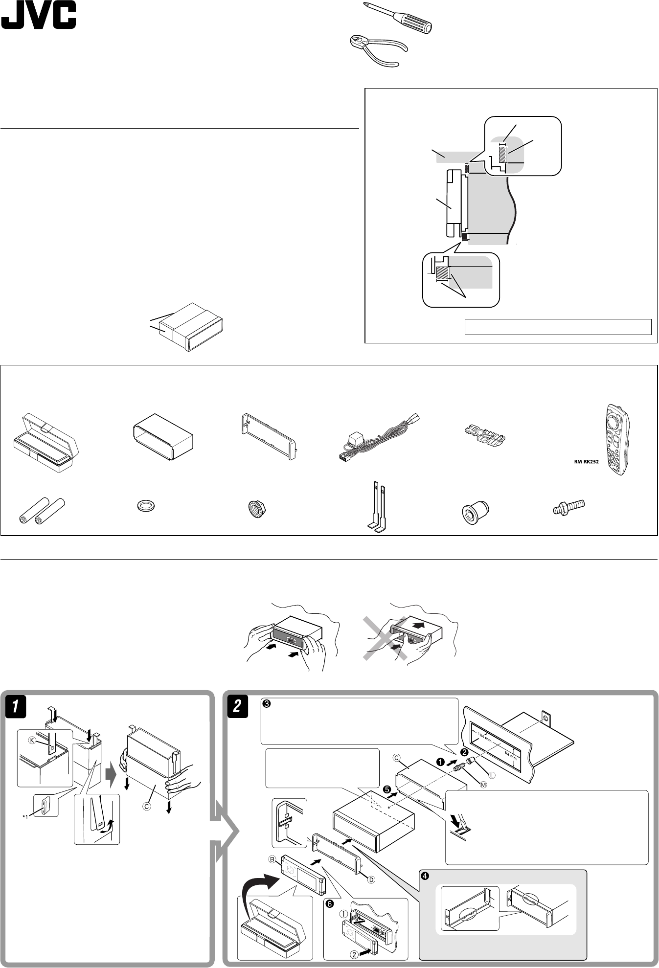 The following illustration shows a typical installation. If you have any questions or require information regarding installation kits, consult your JVC car audio dealer or a company supplying kits.
