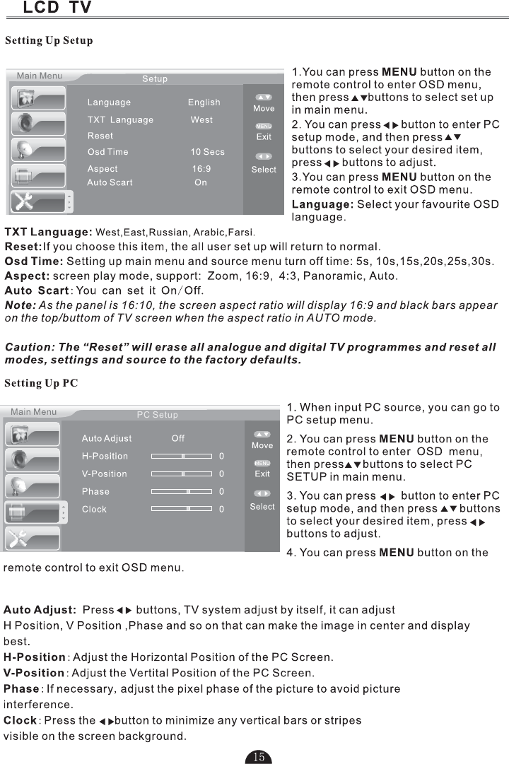 Press to display the set up menu on the TV screen.