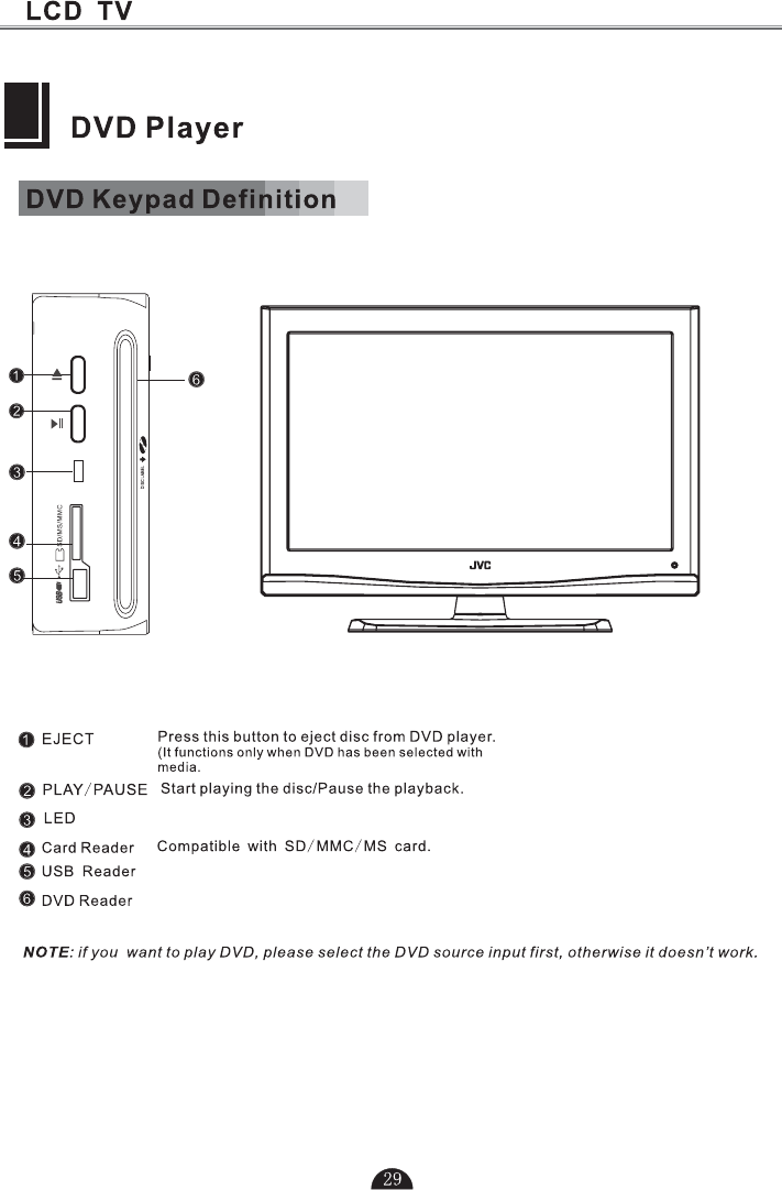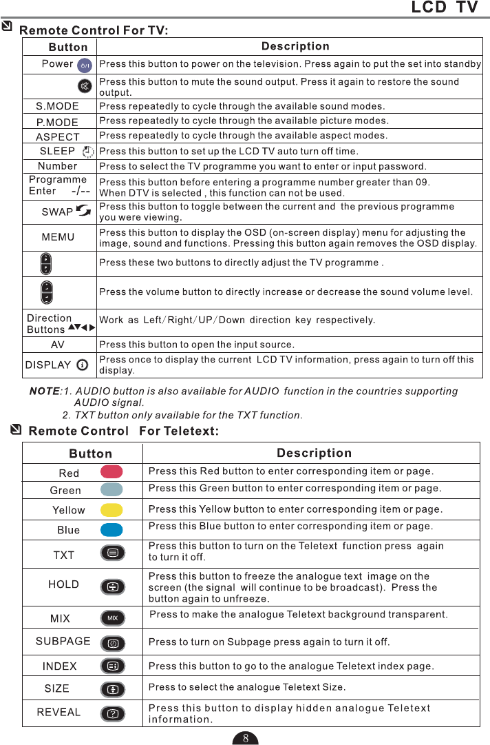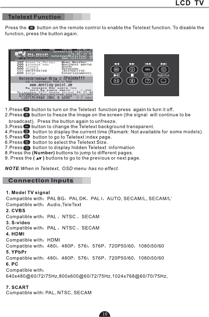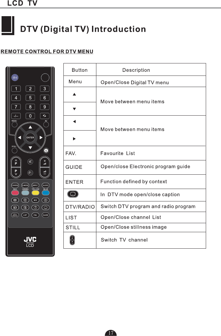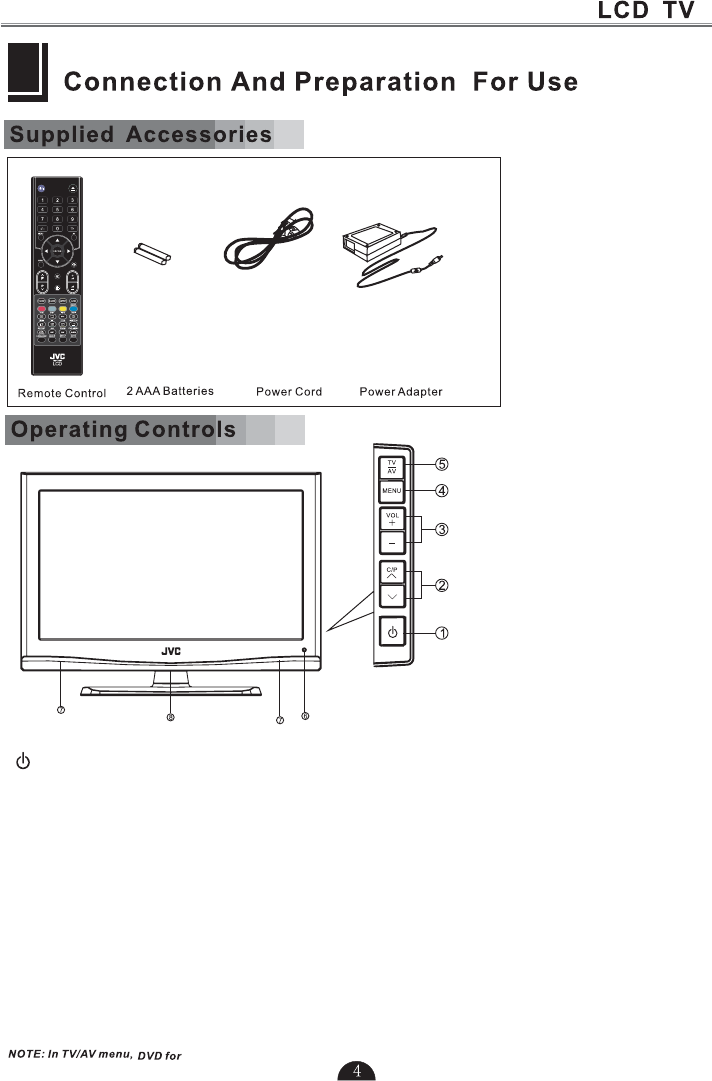 5.Press to select TV or all video input modes TV, AV,DTV S-VIDEO, SCART
