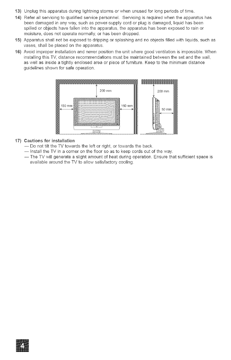 installing this T\!_ distance recommendations must be maintained between the set and the wall,