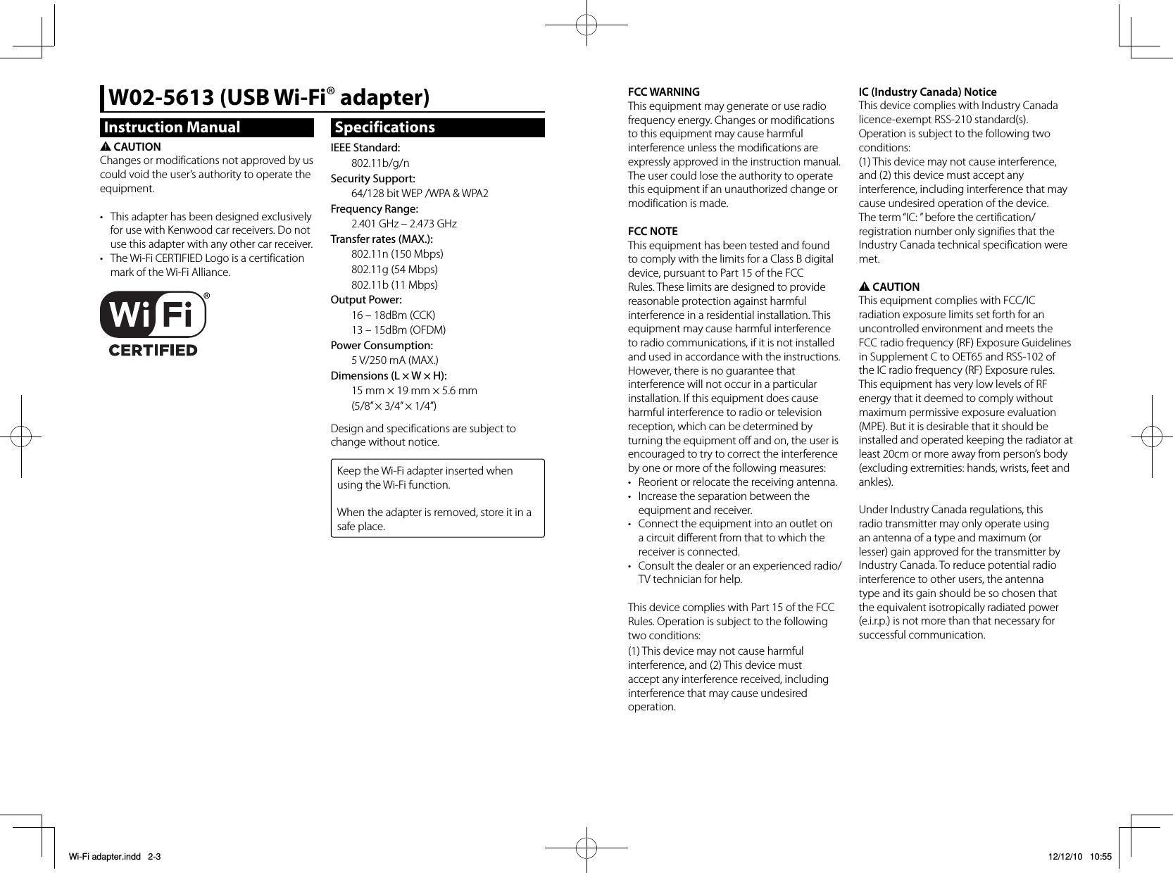 JVCKENWOOD W025613 Wireless Lan USB Adapter User Manual Wi Fi adapter indd