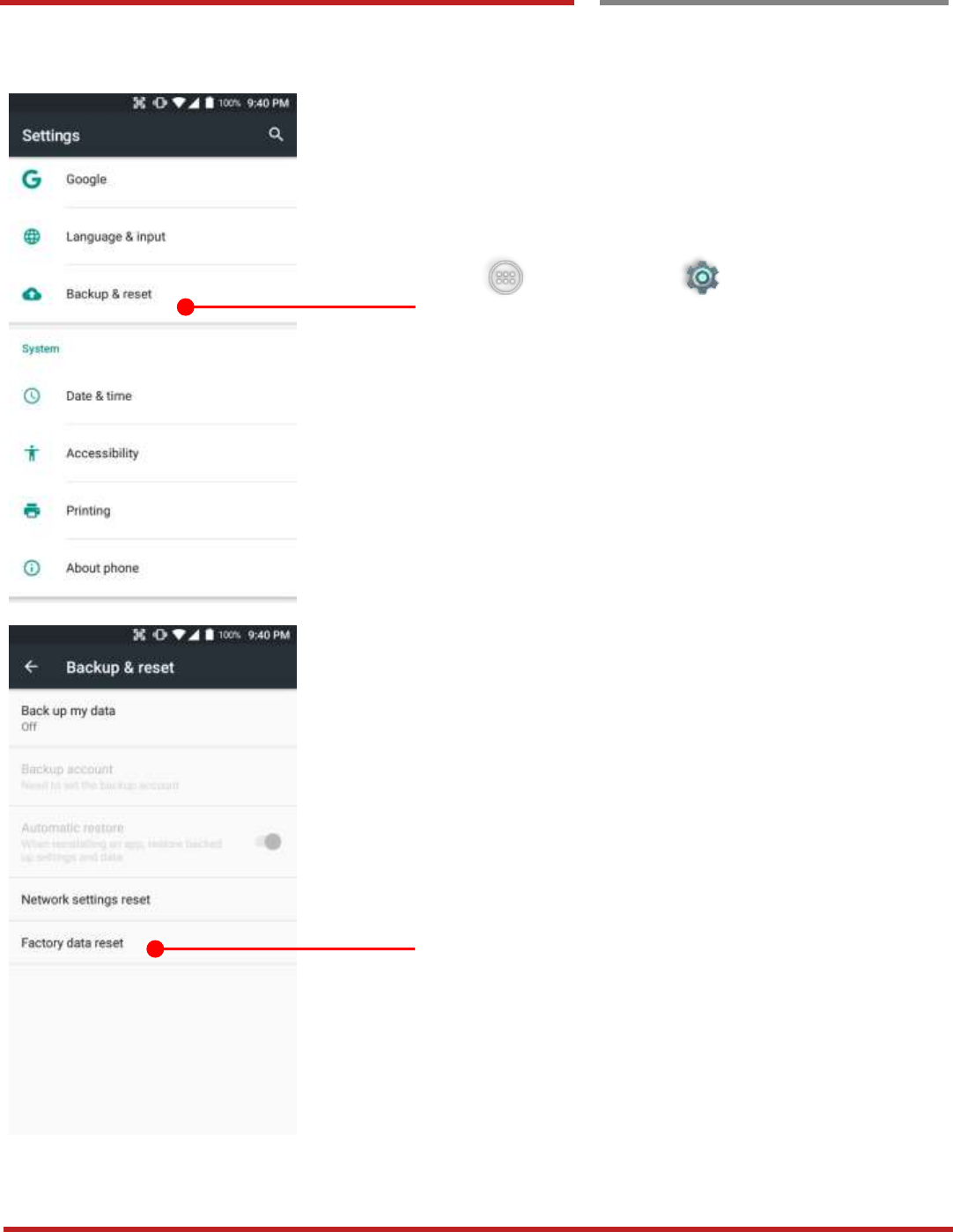 the menu, either “Backup & Reset”, or “Factory Reset”. For more details, please refer to “Factory data reset”