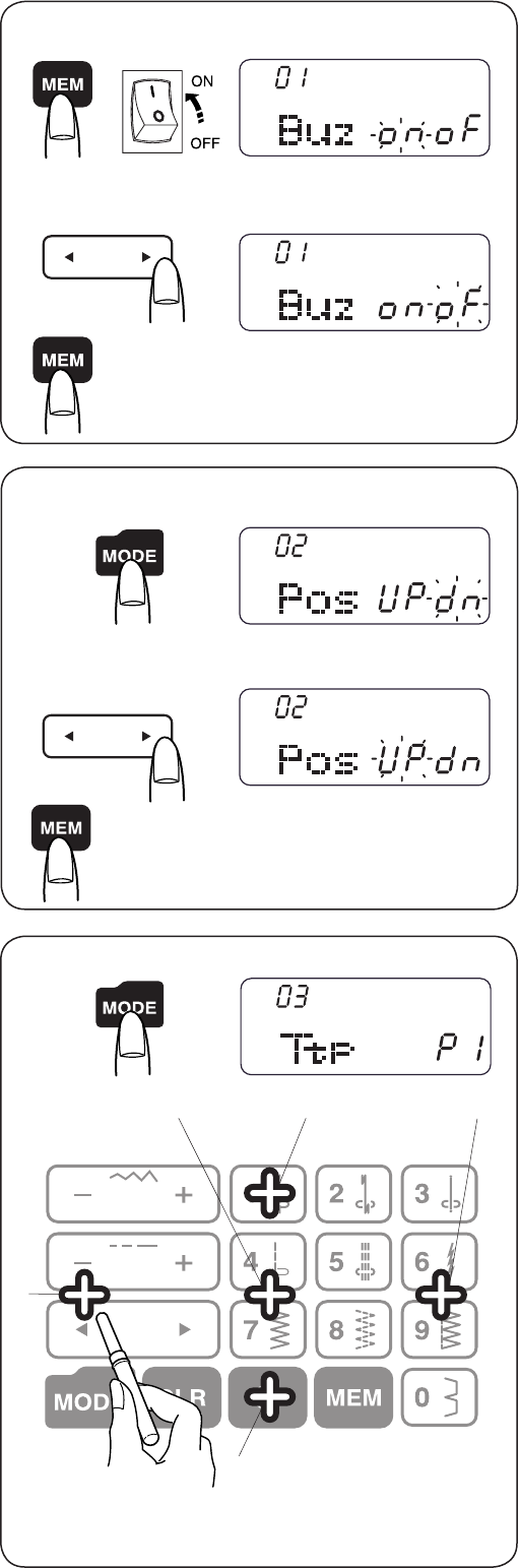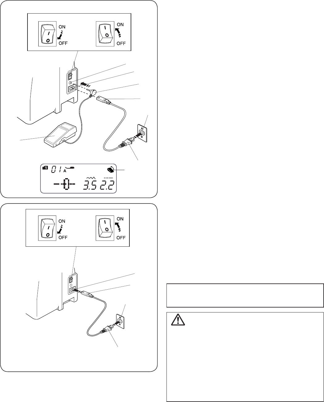 14. Switch this sewing machine off (“O”) when making any adjustment in the needle area, such as threading the