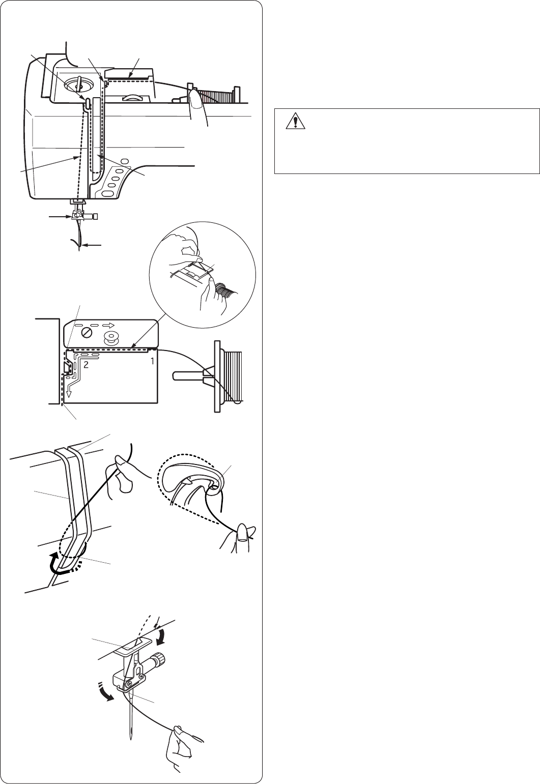 14. Switch this sewing machine off (“O”) when making any adjustment in the needle area, such as threading the
