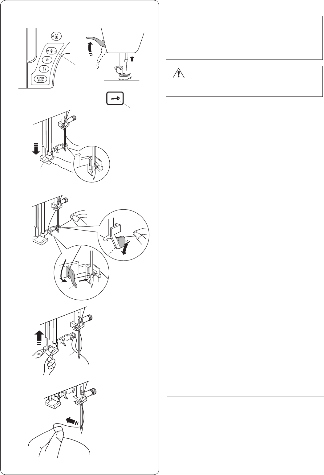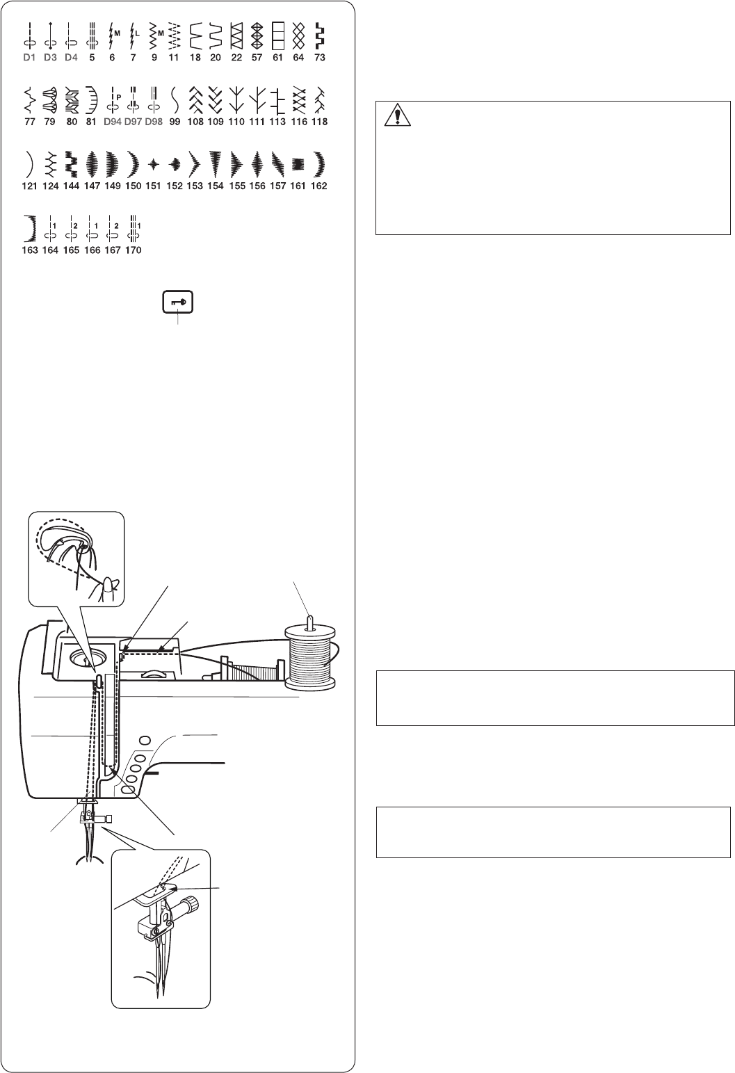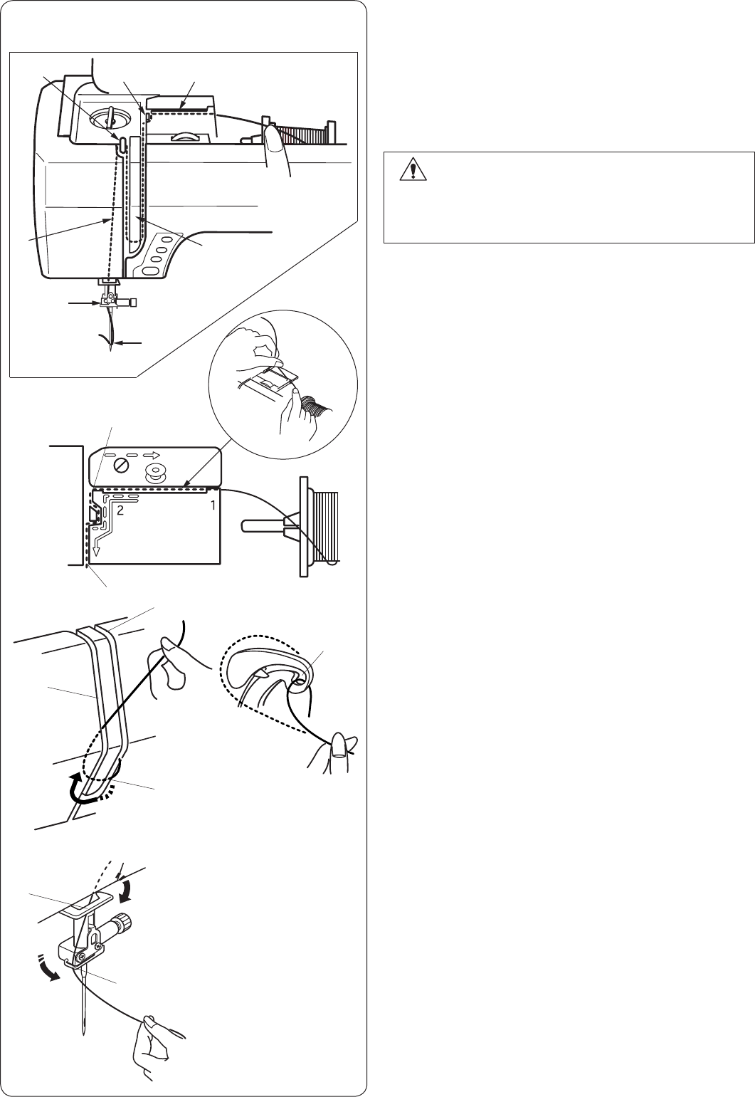 14. Switch this sewing machine off (“O”) when making any adjustment in the needle area, such as threading the