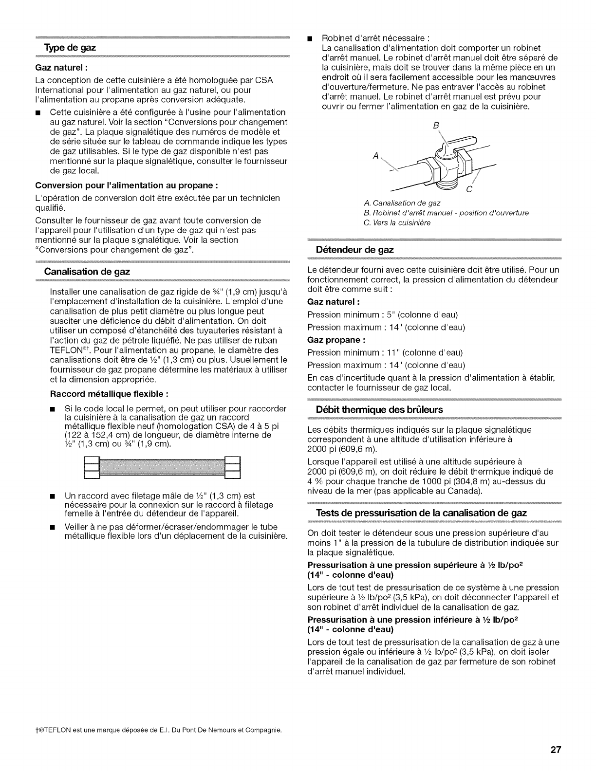 Specifications de I'alimentation en gaz ..................................... 26