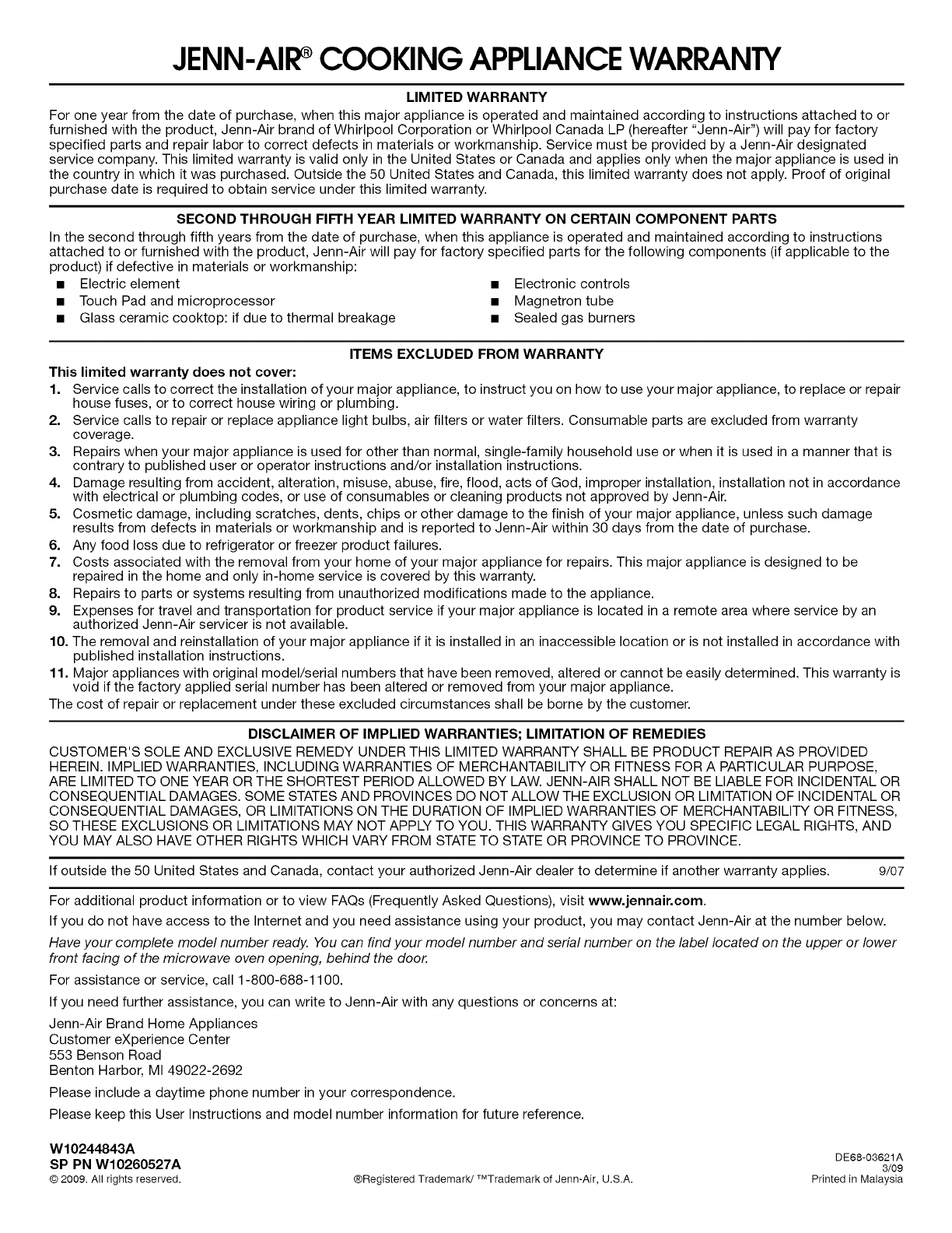 If outside the 50 United States and Canada, contact your authorized Jenn-Air dealer to determine if another warranty applies. 9/o7