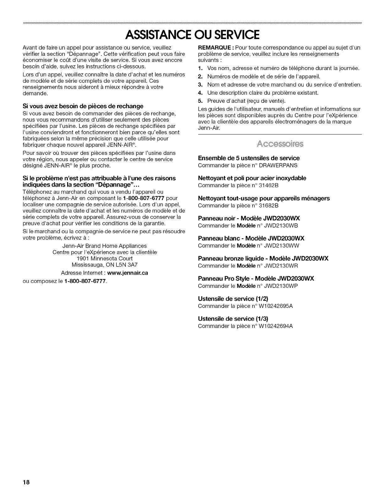 Au Canada, pour assistance, installation ou service, composez le 1-800-807-6777 ou visitez notre site web a www.jennair.ca.