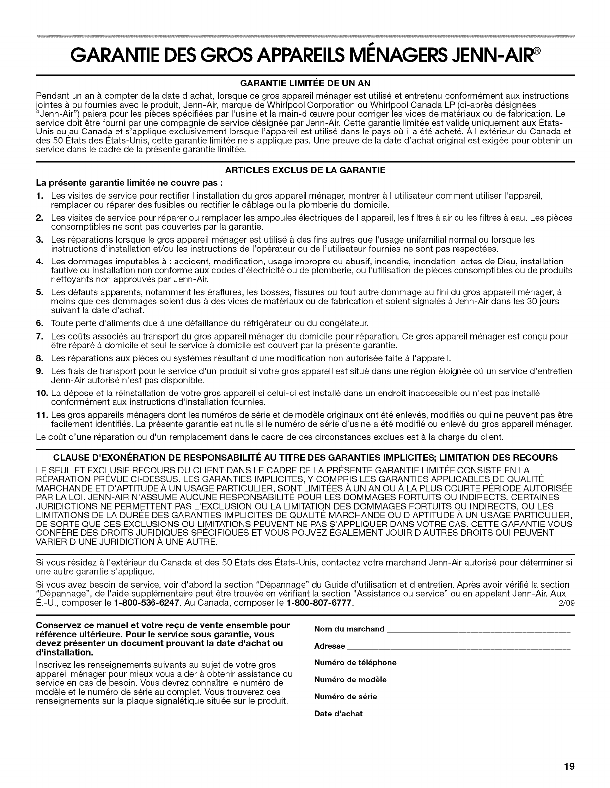 PAR LA LOI. JENN-AIR N'ASSUME AUCUNE RESPONSABILITI 2 POUR LES DOMMAGES FORTUITS OU INDIRECTS. CERTAINES