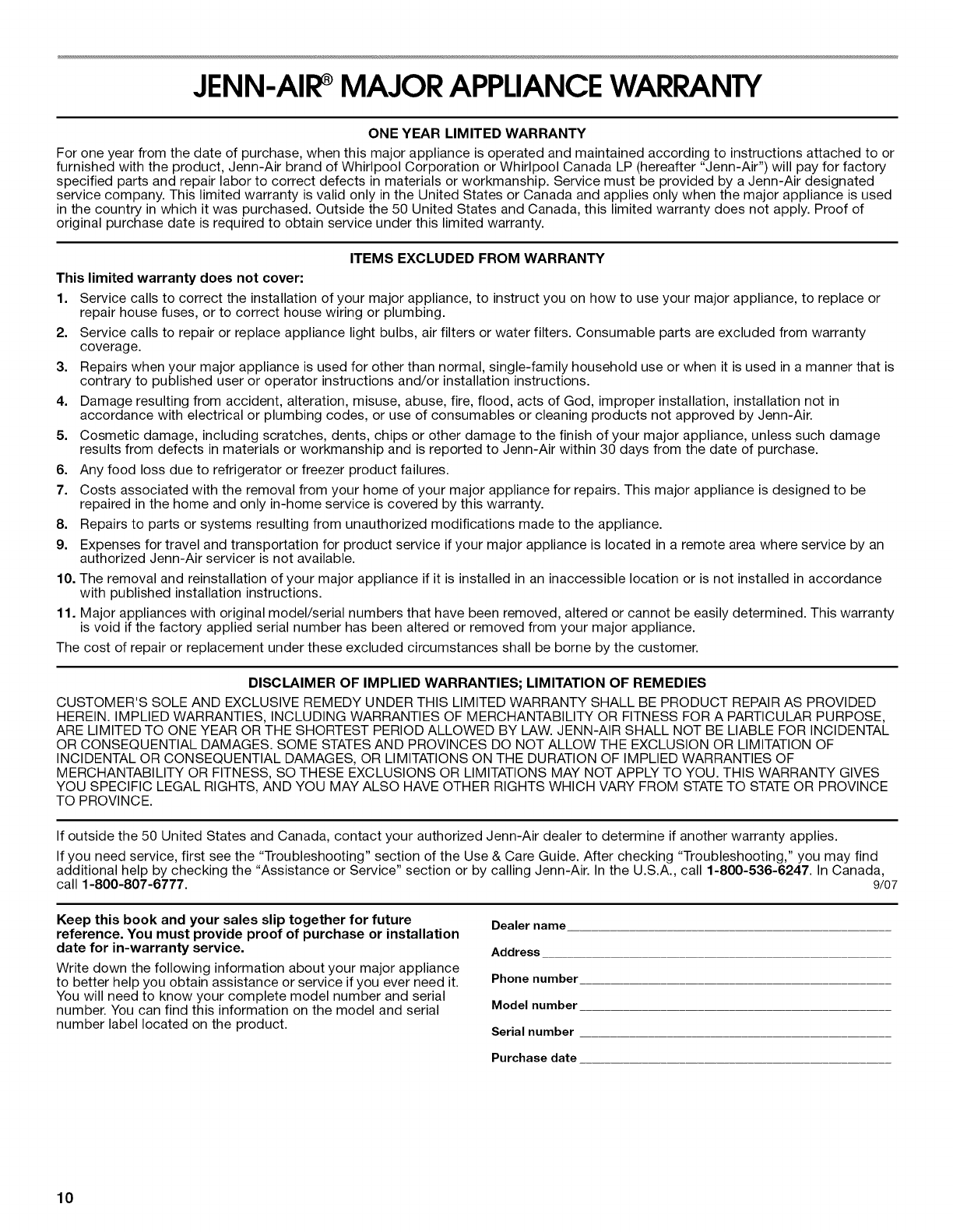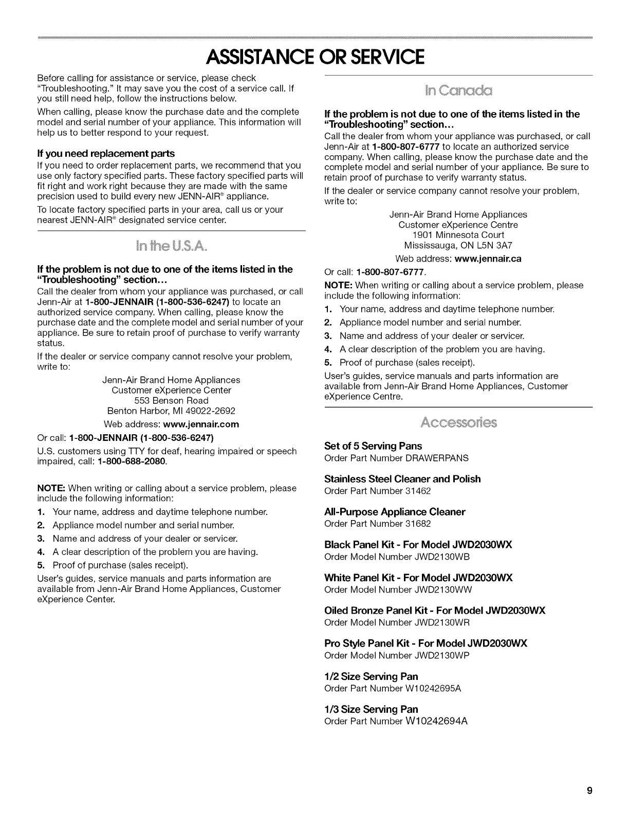 In Canada, call: 1-800-807-6777, or visit our website at www.jennair.ca.