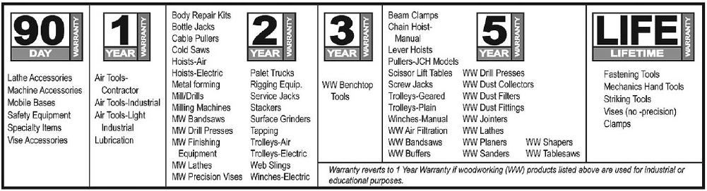 JET products carry a limited warranty which varies in duration based upon the product (MW stands for Metalworking, WW