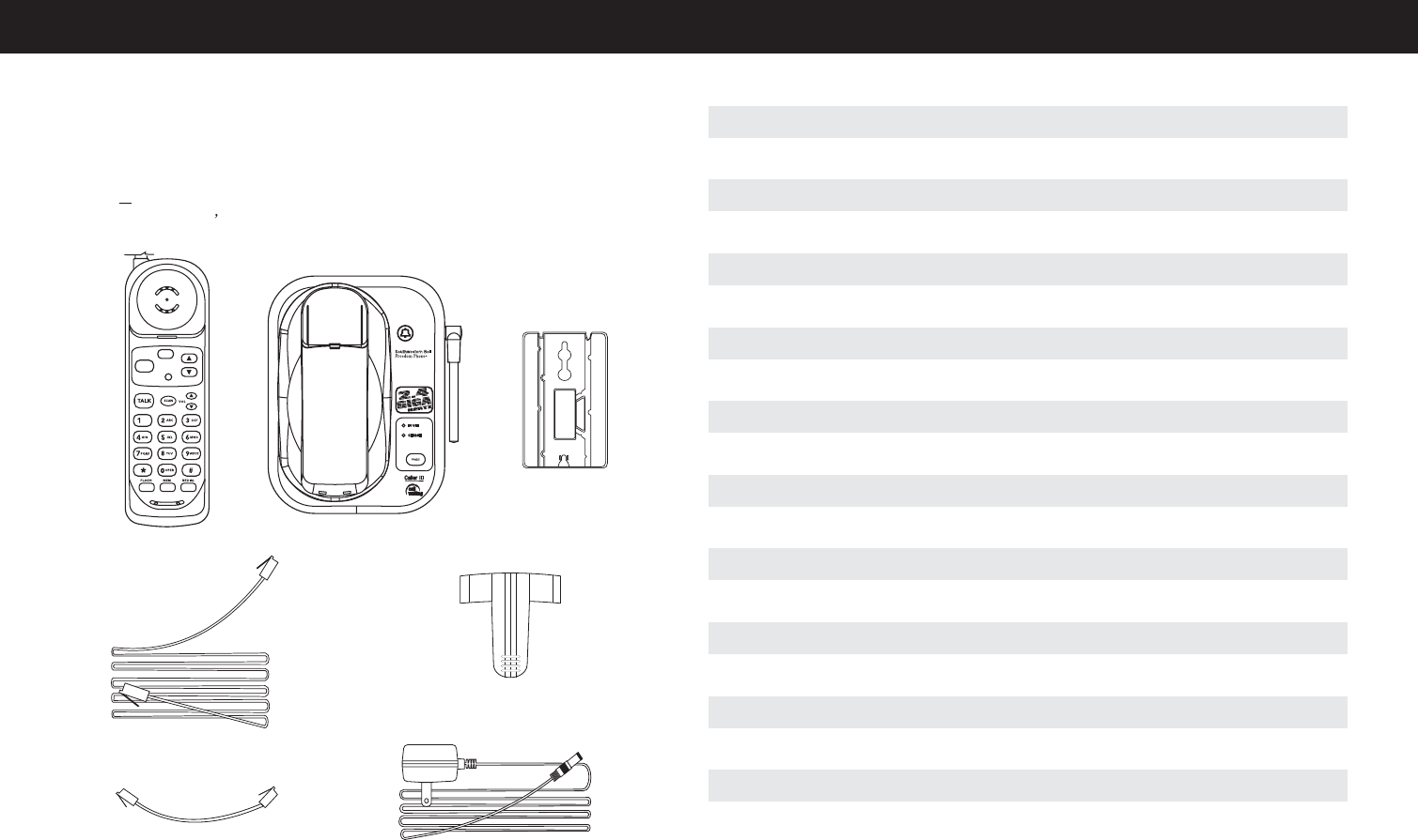 system. You should have a HANDSET, BASE UNIT, BELT CLIP, AC ADAPTOR,