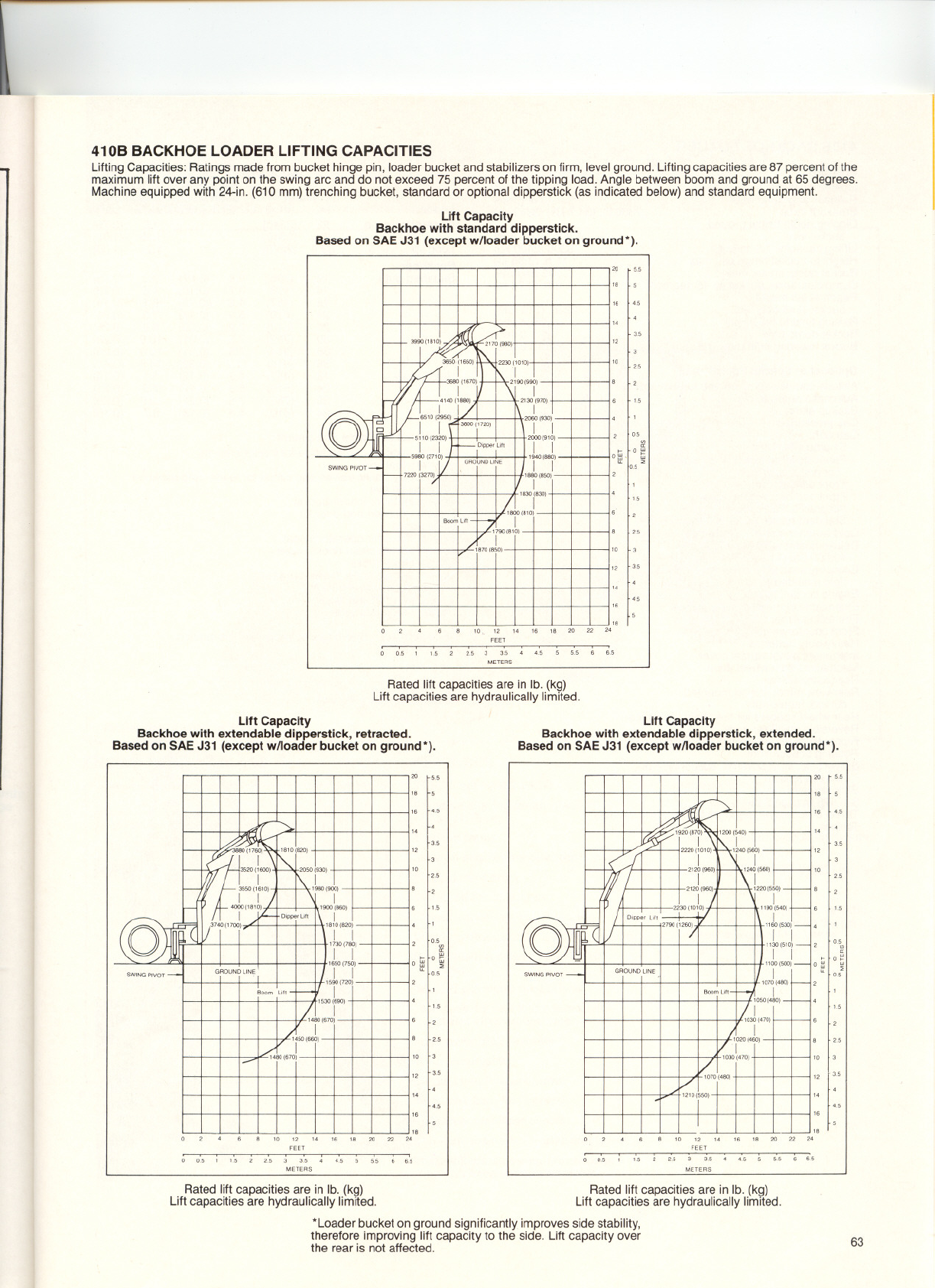 are based on a unit with 17.5L-24, 10 PR, R4 rear tires; 11L-15, 10 PR, F3 front tires; 1.0-cu.-yd. (0.76 m3) loader bucket; 24-in. (610 mm) standard duty backhoe bucket, RaPS/FOPS, full
