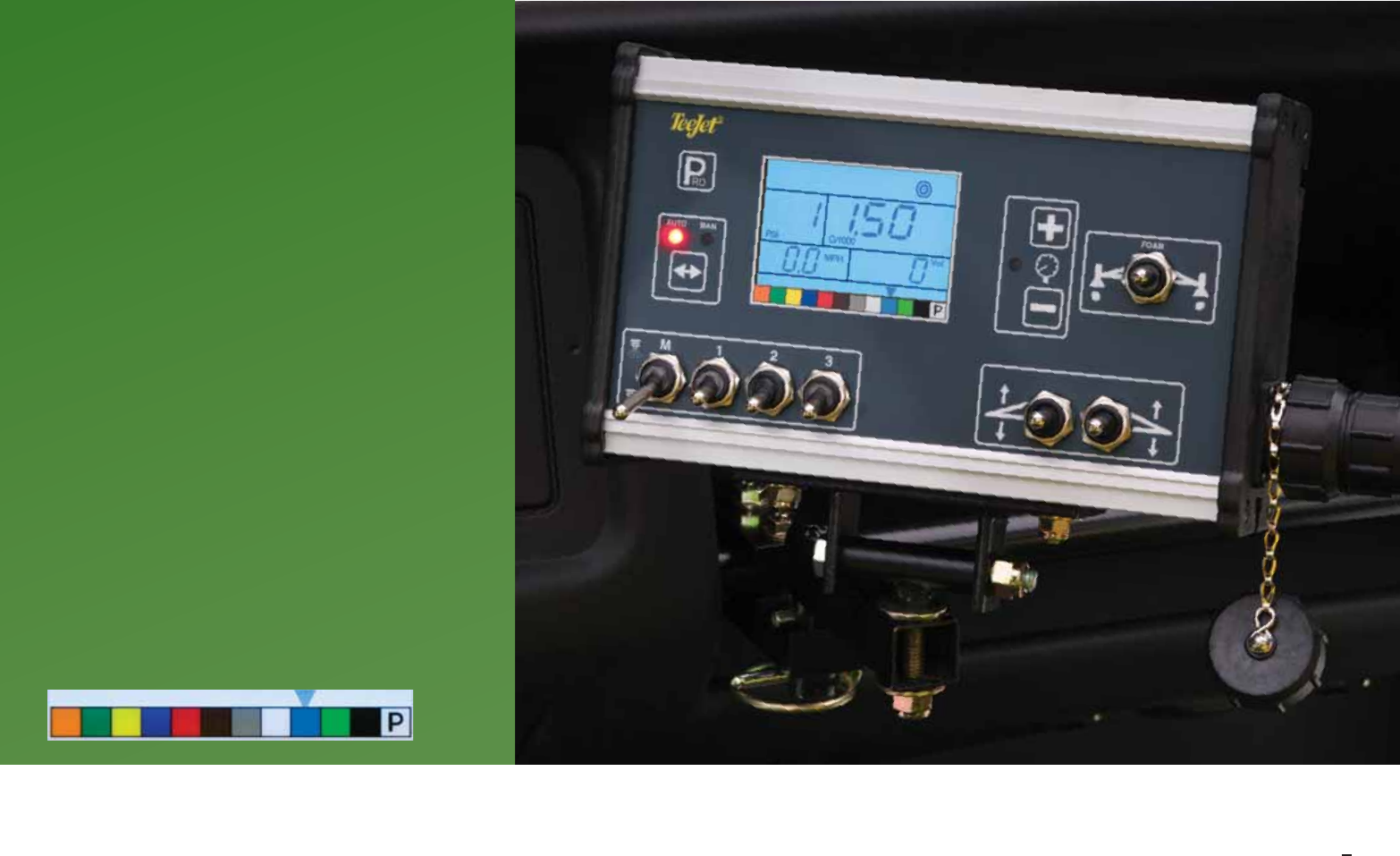 Switches on control box Individual Boom On/Off, Boom Master, Foam Marker, Boom Lift/Lower, Pressure Increase/Decrease, Auto/Manual