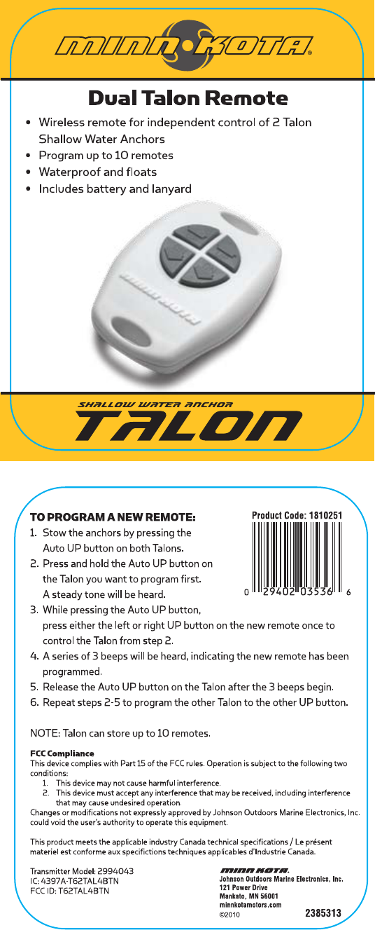 Johnson Outdoors TAL4BTN Anchor Remote Control Transmitter User Manual 2385313 Talon 4 Button Replacement Remote small