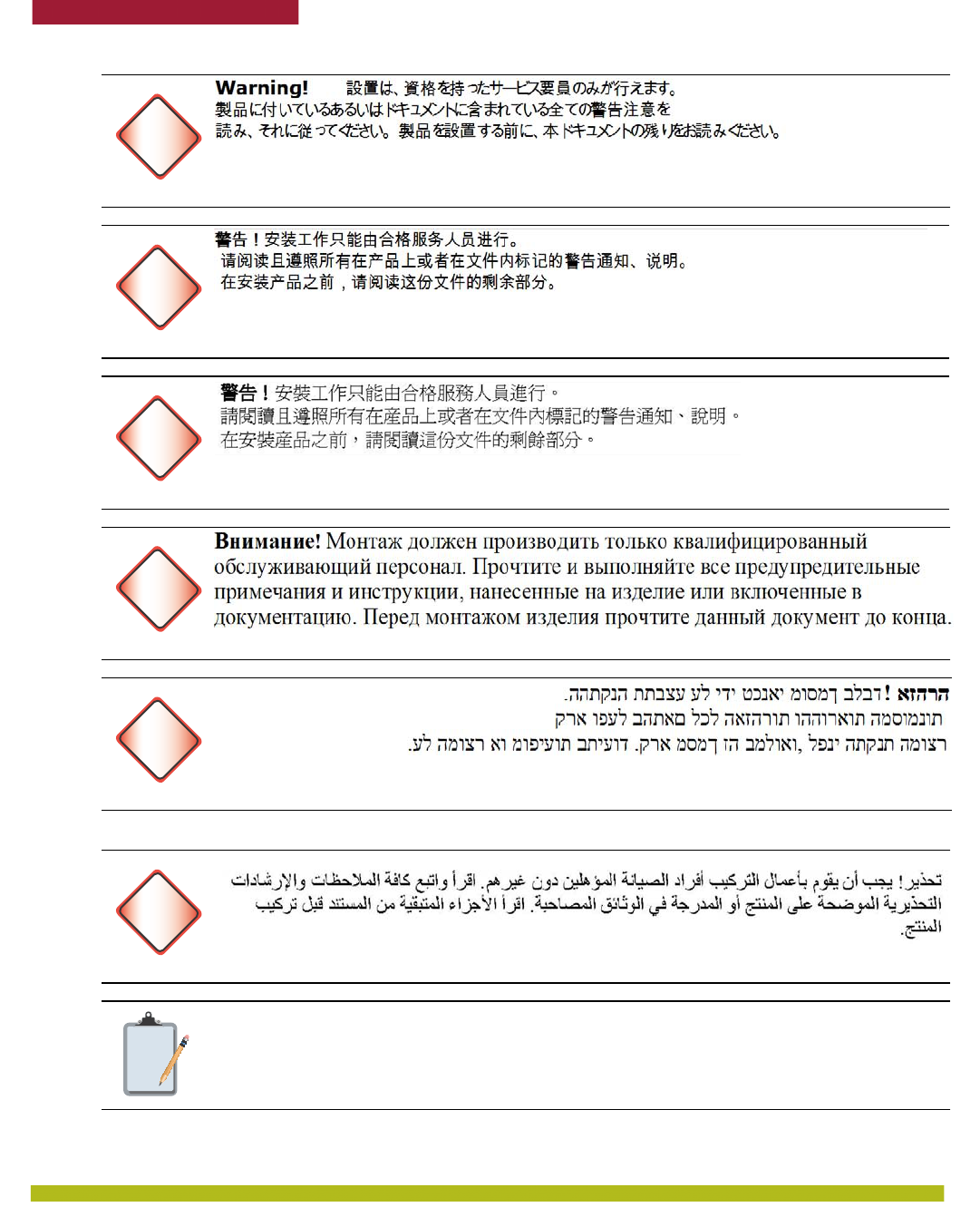 Warning! Installation must be performed by qualified service personnel only. Read and
