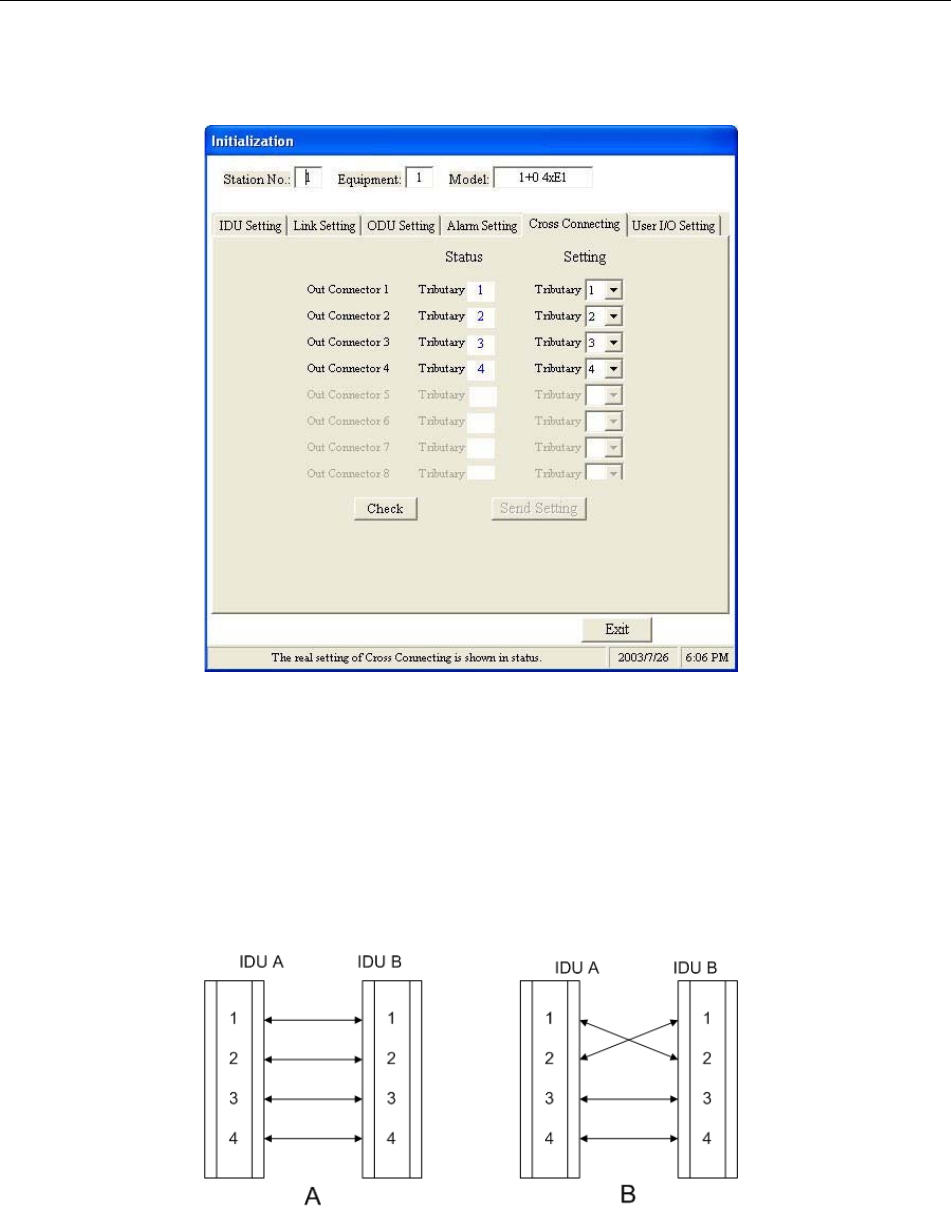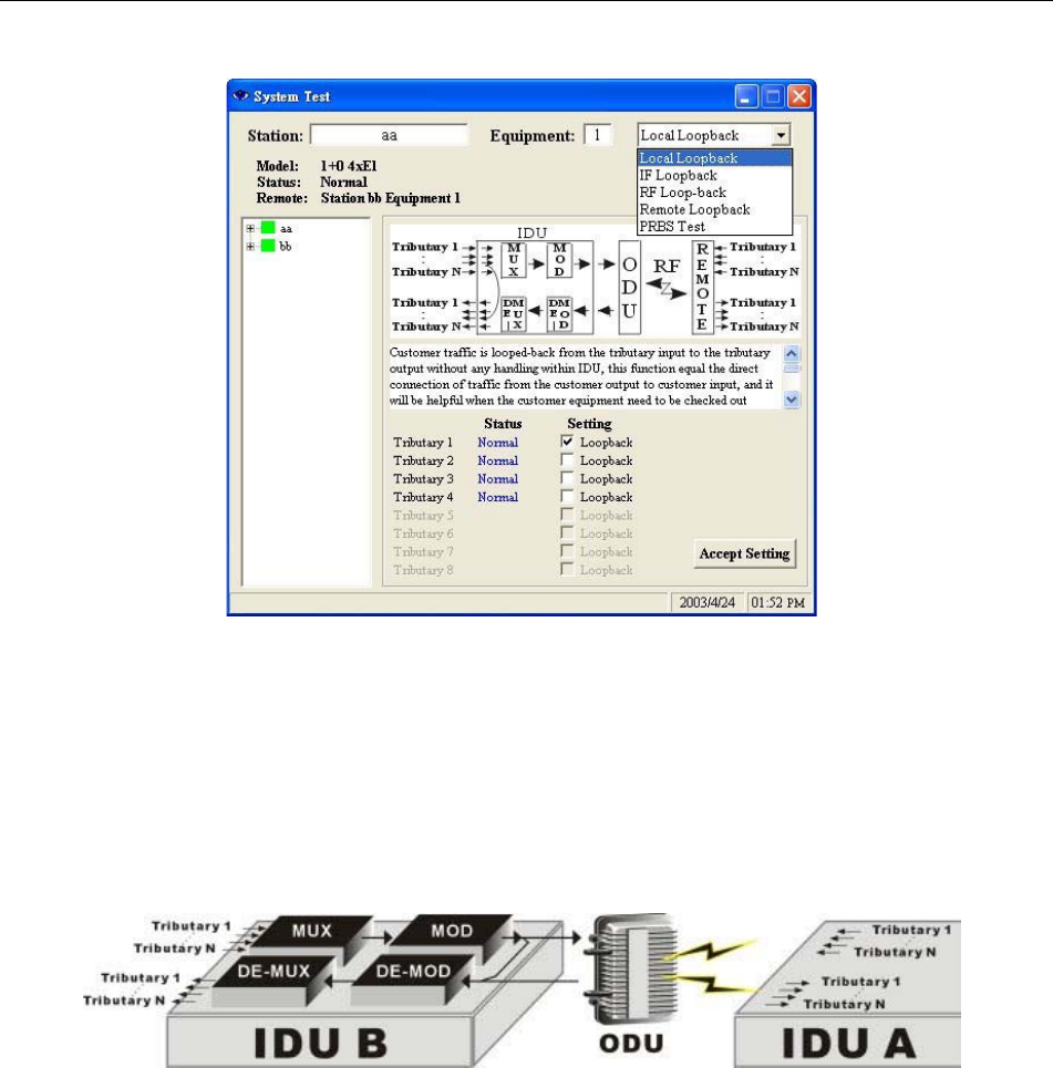 In the System Test window, tick the Setting column for Tributary 1. Press Accept Setting. The IDU’s first E1
