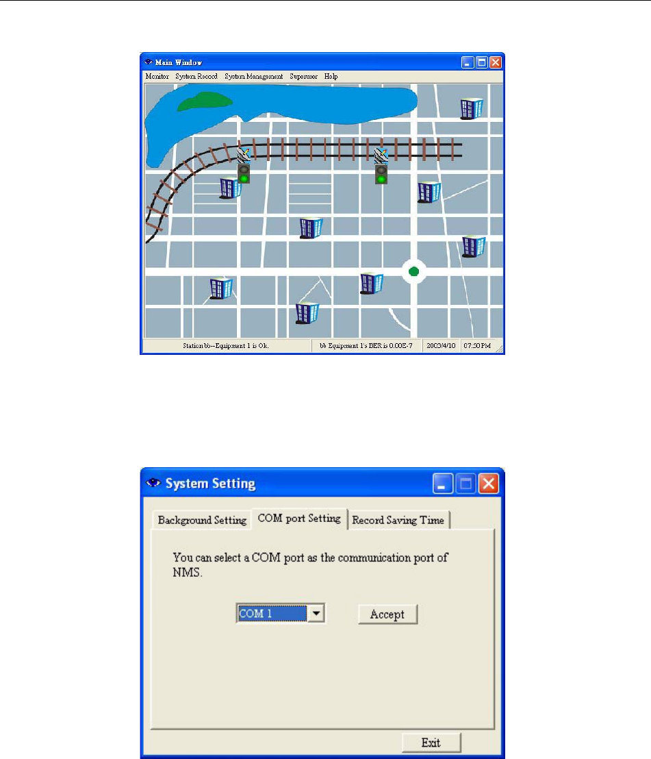 In COM port Setting tab, you can select a COM port as the communication port of NMS. Press Accept after