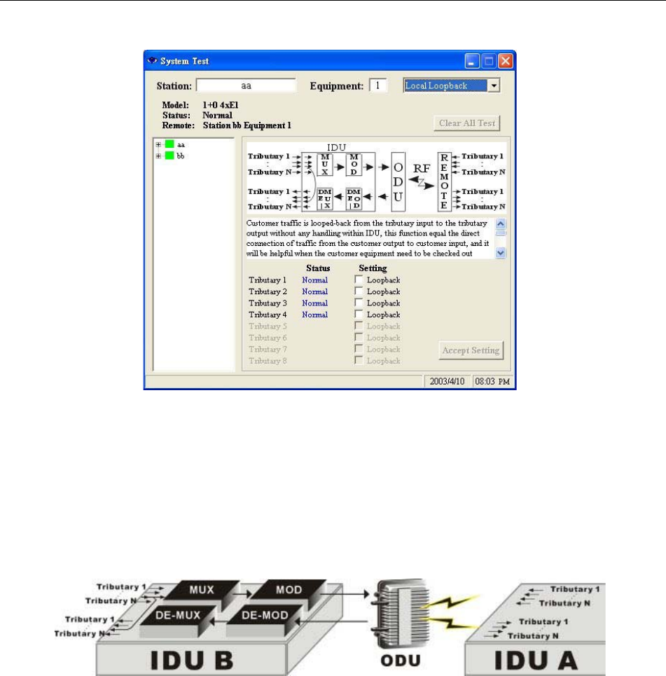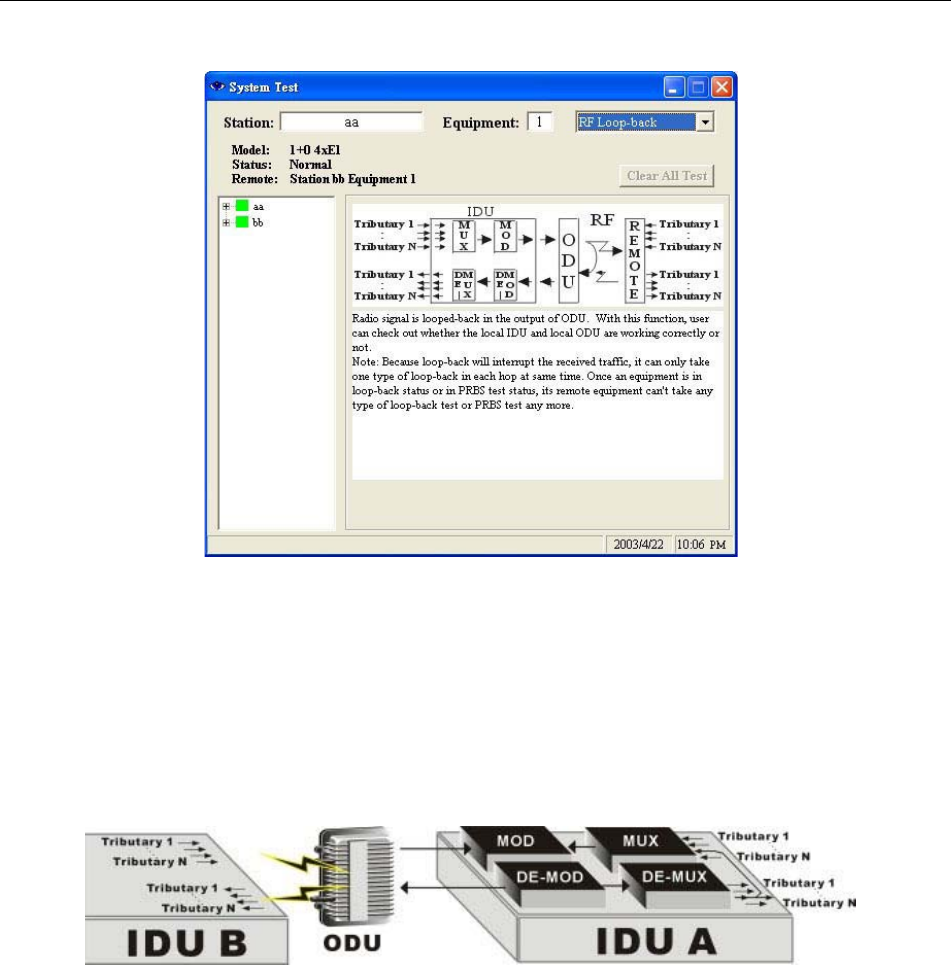 Under RF Loopback, a self-detection test on the working conditions of both the IDU and ODU is carried out. This
