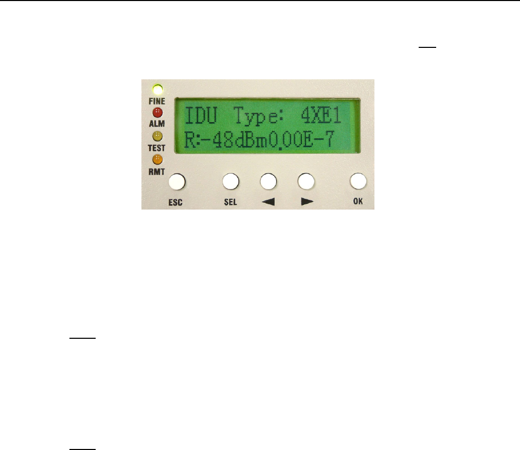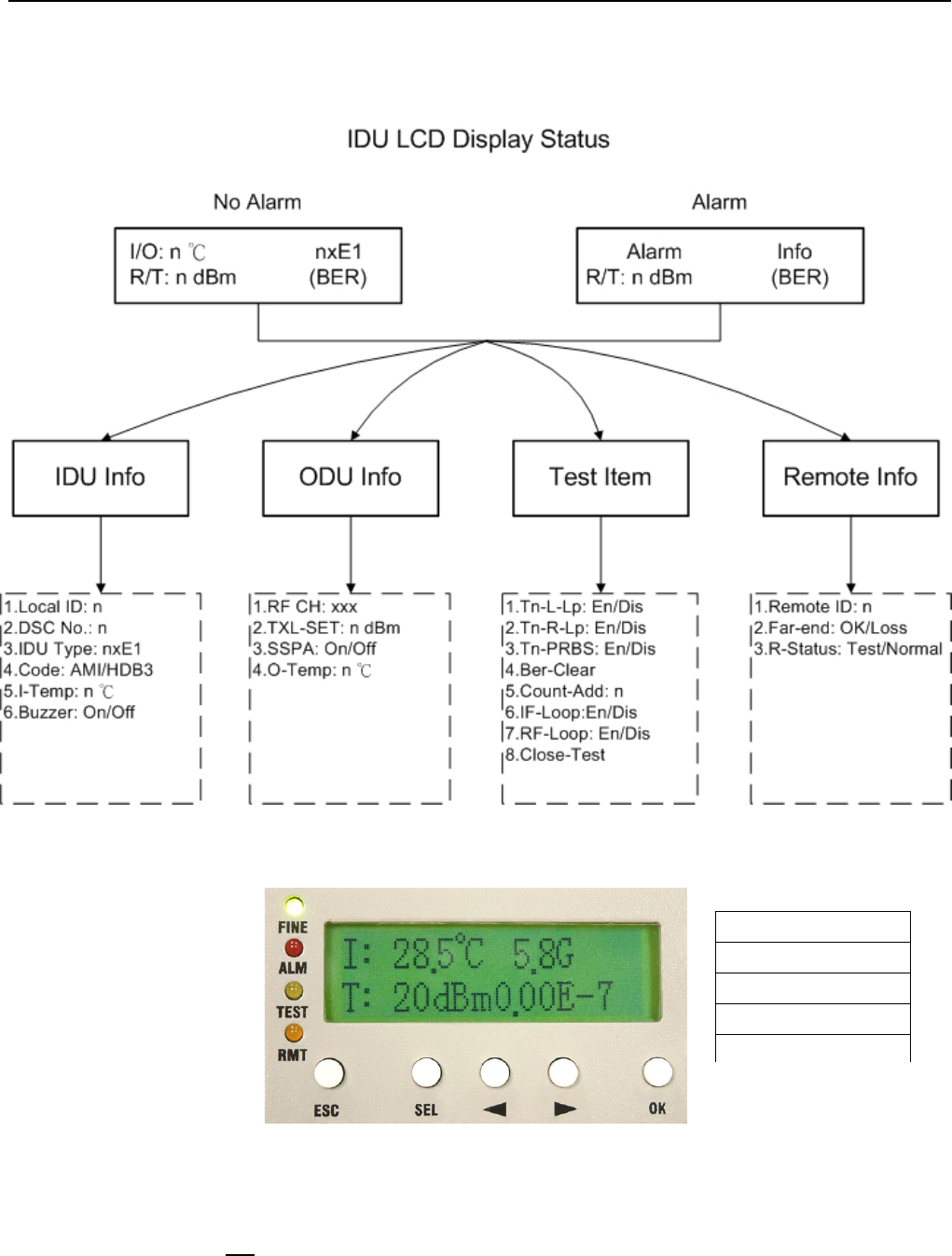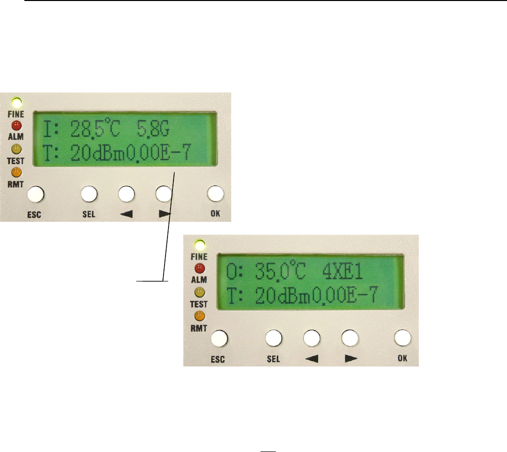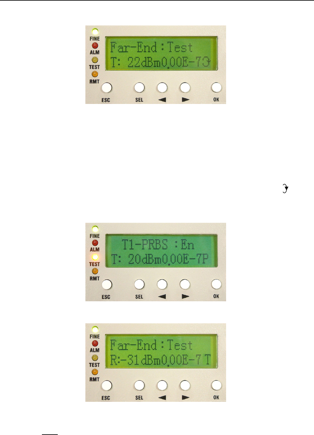 appear at the right bottom of the LCD. Remote end’s TEST led will turn orange too with “T” display on the front
