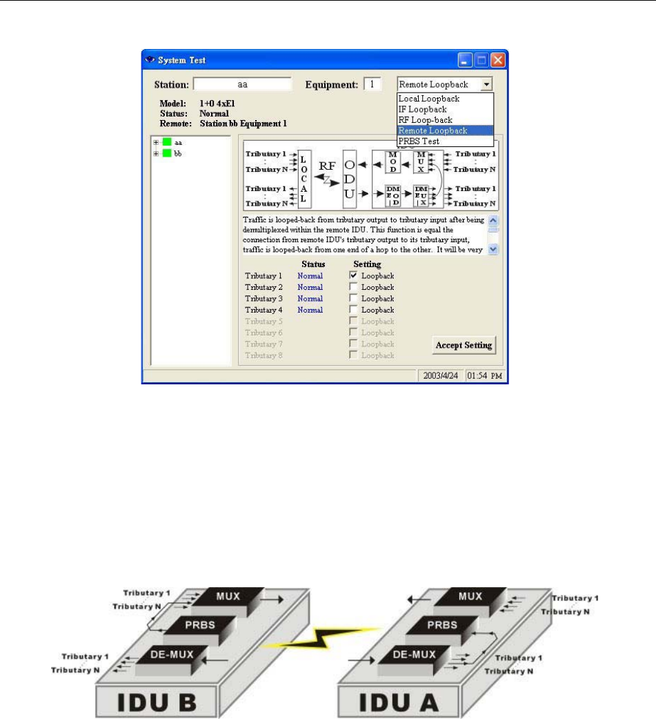 In the System Test window, tick the Setting column for Tributary 1. Press Accept Setting. The IDU’s first E1
