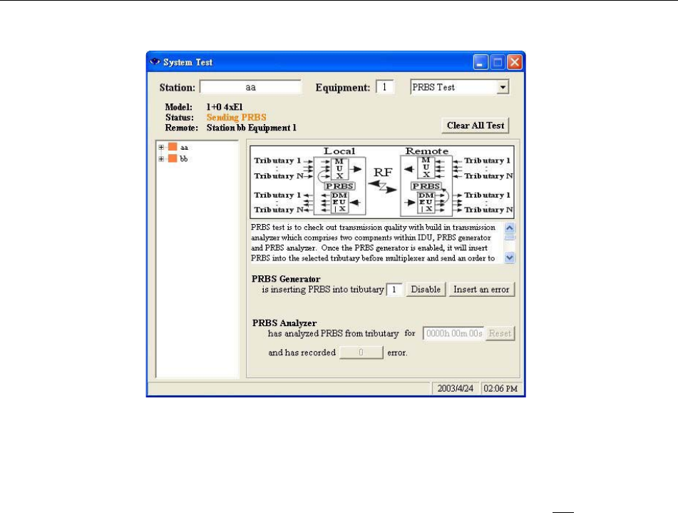 In the System Test window, enter “1” for PRBS Generator. Press Enable. The IDU’s first E1 interface is now