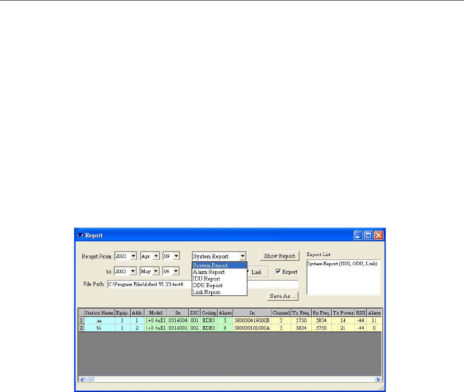 System Report: There are 5 kinds of reports - System ReportΕAlarm ReportΕIDU ReportΕODU ReportΕLink