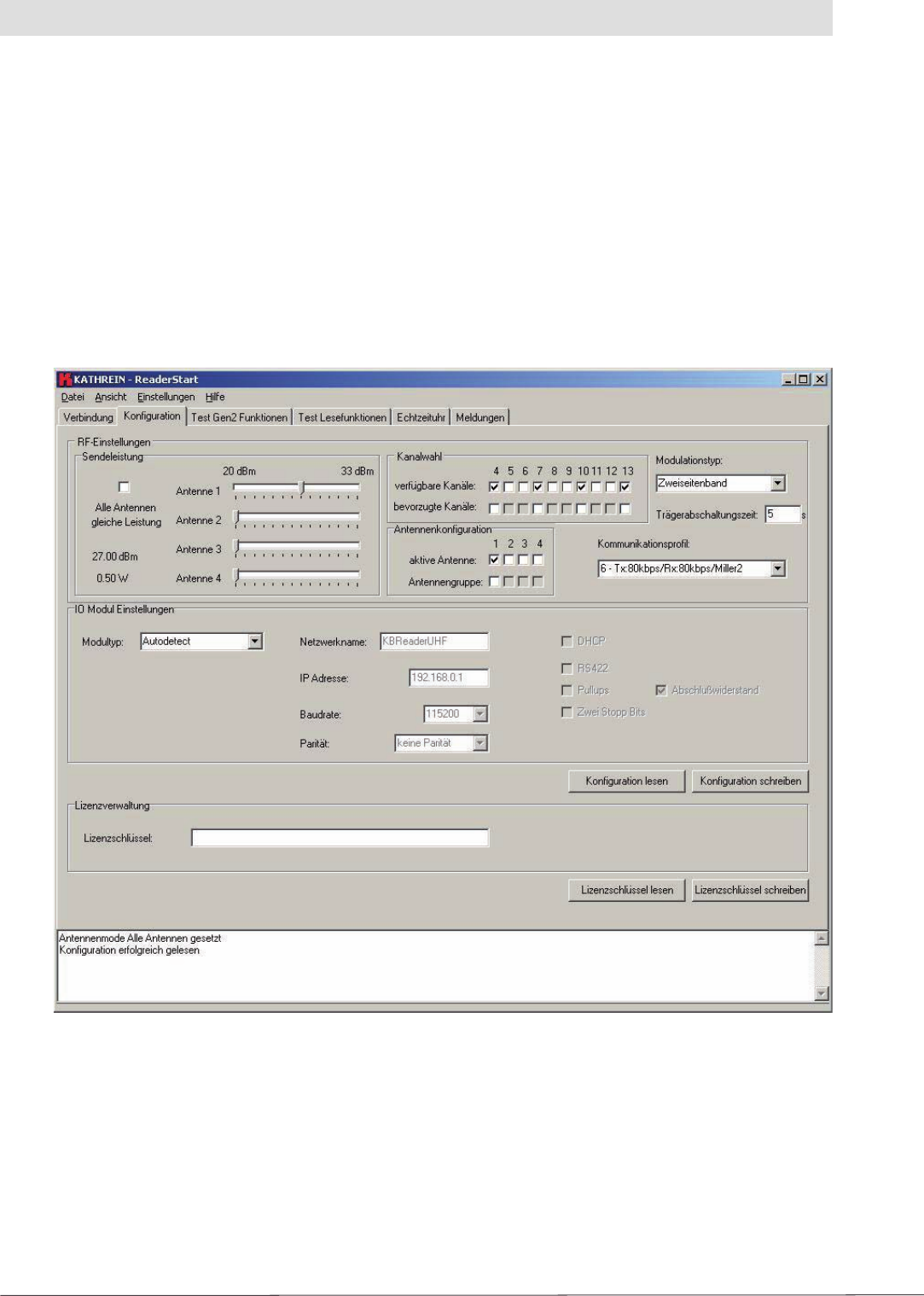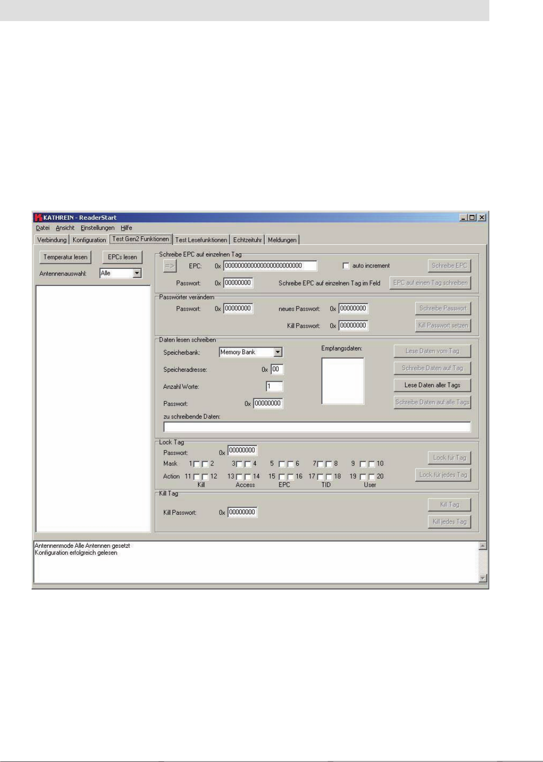 Here the reader's real-time clock can be read and set. Click the “Zeit lesen” (Read time) button to read