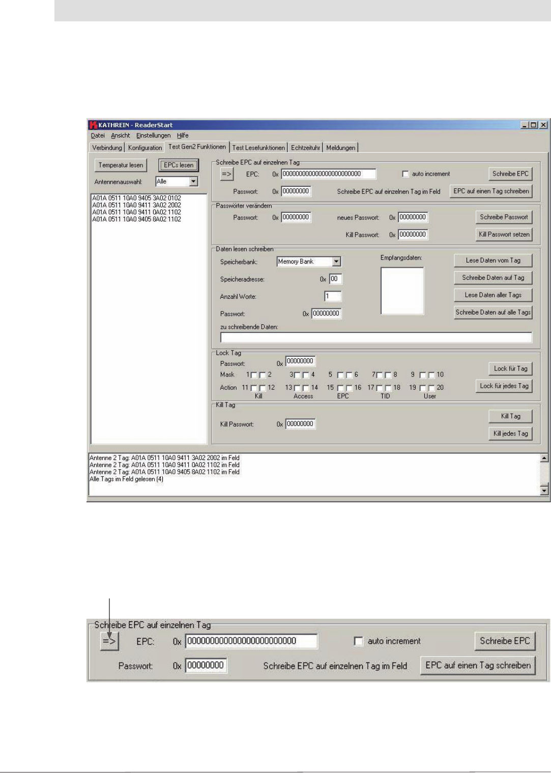 Here the format of the font for the EPC fi eld on the “Test Lesefunktionen” (Test read functions)