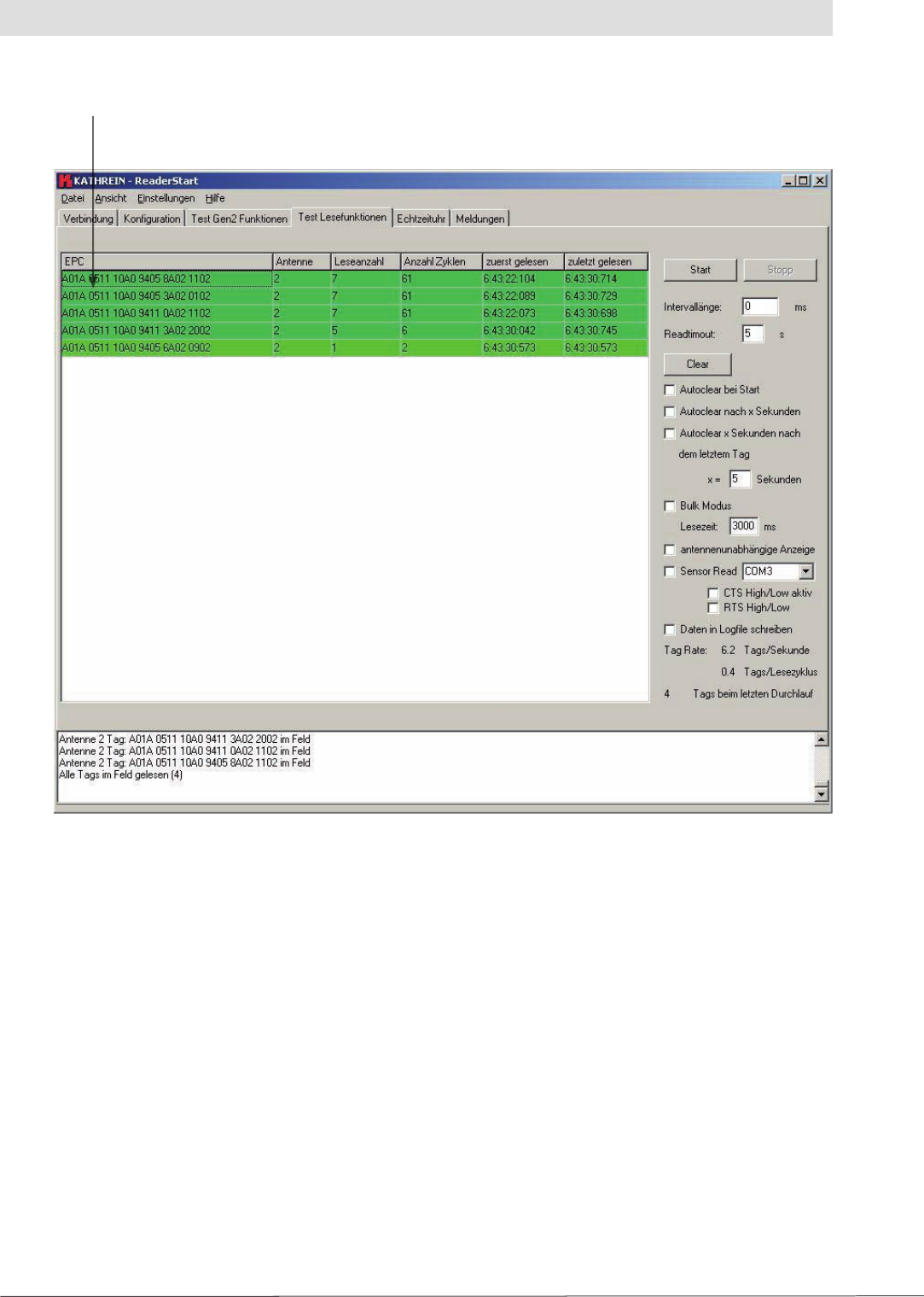 stated in the “Lesezeit” (Read time) fi eld has elapsed. All the tags read are then transferred to the