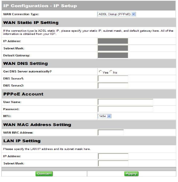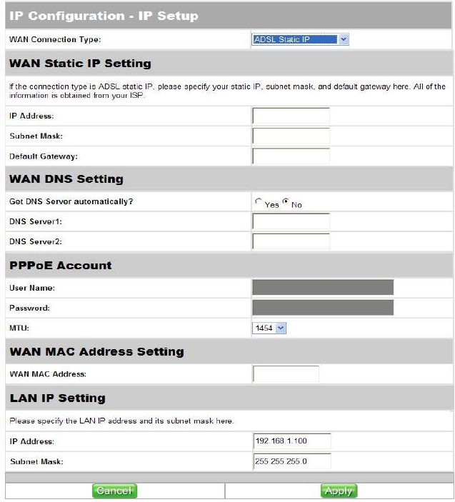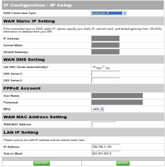 z WAN type : static ADSL, PPPoE, automatic IP, cable modem