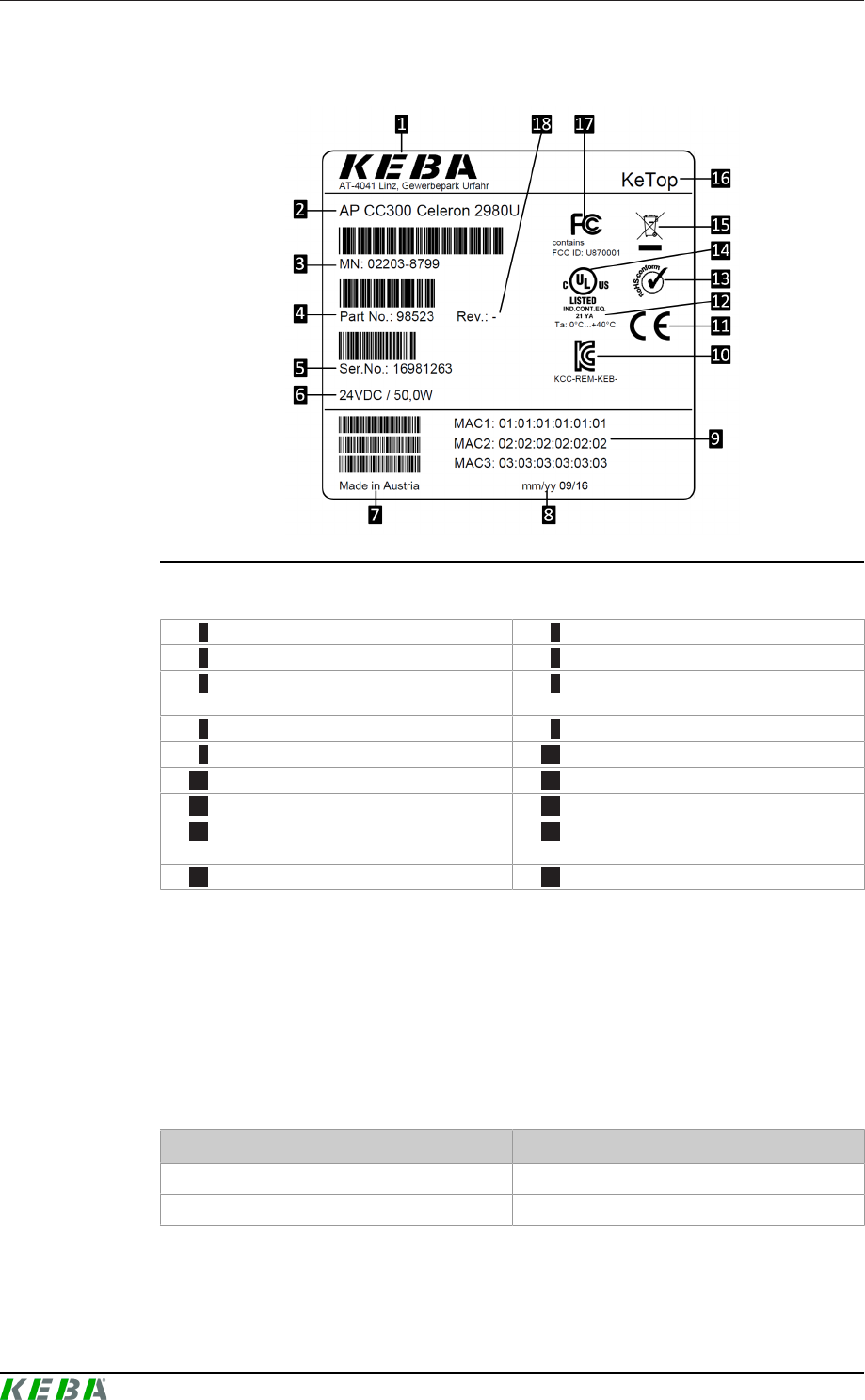 Eine genaue Auflistung der Inhaltsstoffe des Geräts kann bei KEBA angefor-