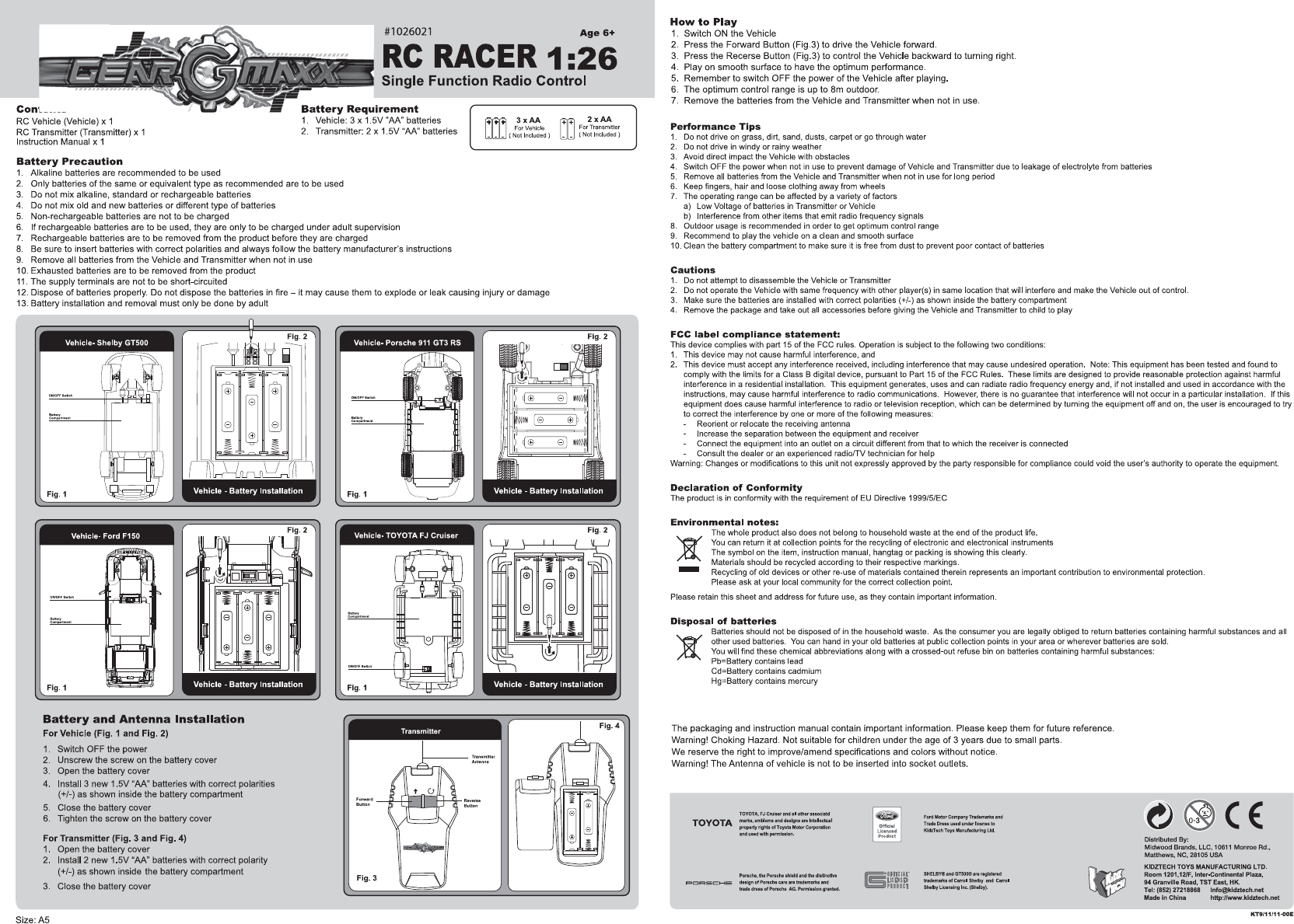 KIDZTECH TOYS 15643TX-27 1/26 RC Single Function Cars & Trucks User Manual 15643 1 26 SingleFunction IM 06