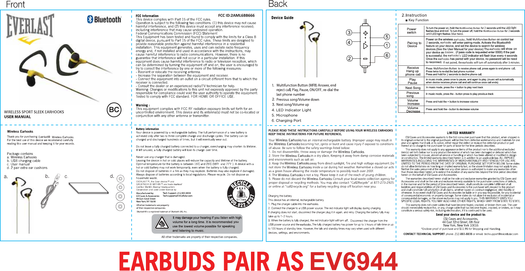 KINGRAY ELECTRONICS Co., LTD Bluetooth earphone EV6944 Wireless Earhooks manual 0409
