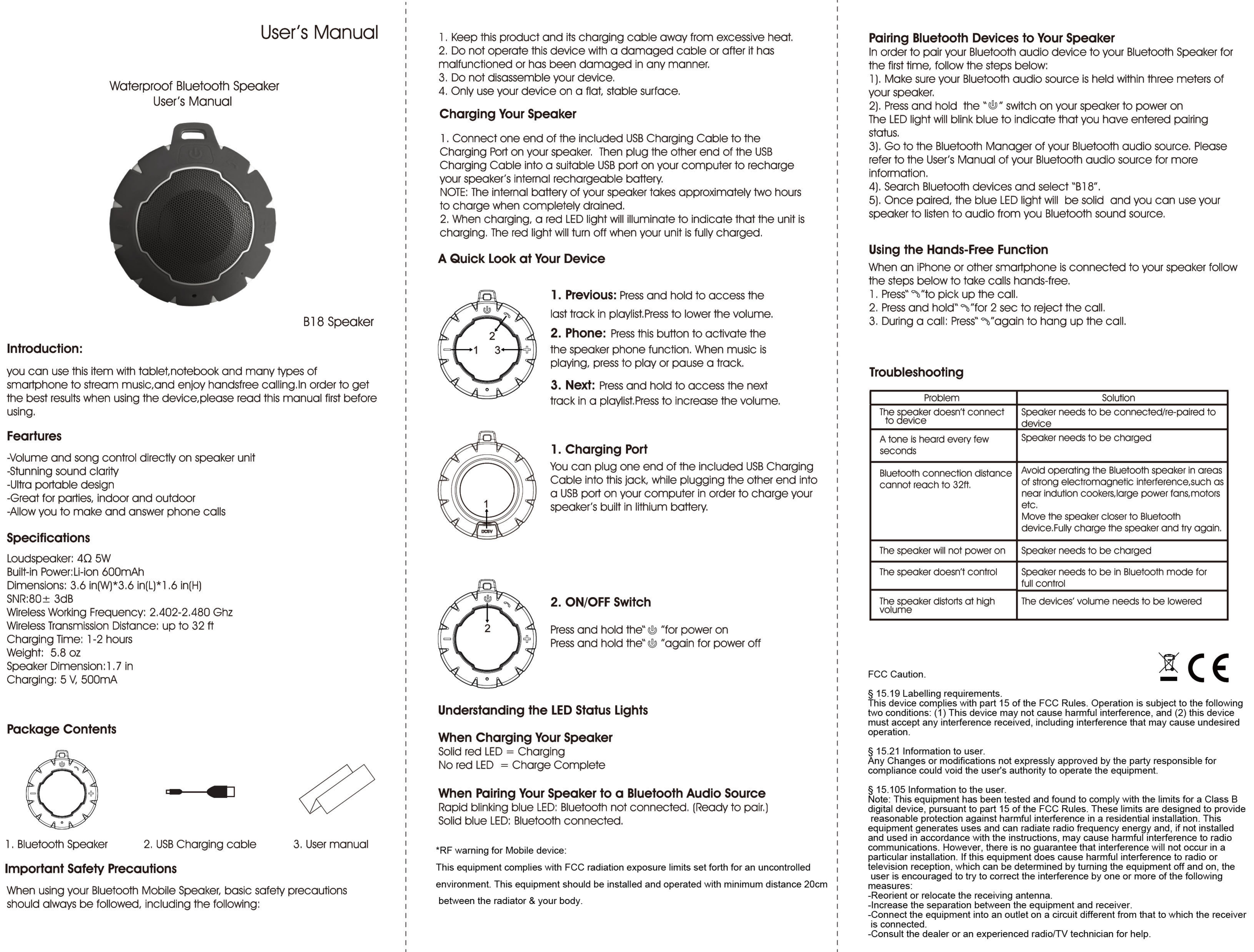 KINGTA TECHNOLOGY B18 Waterproof Bluetooth Speaker User Manual
