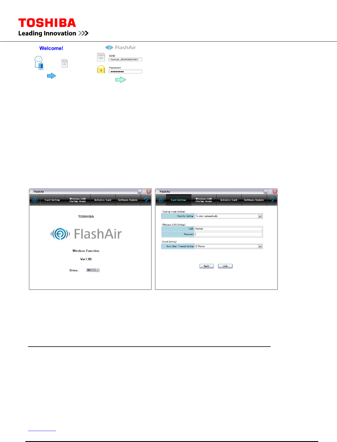 (1) Insert the Product into the PC. Go to the Product’s directory and double-click “FlashAir.exe” to install the Product’s software. After the