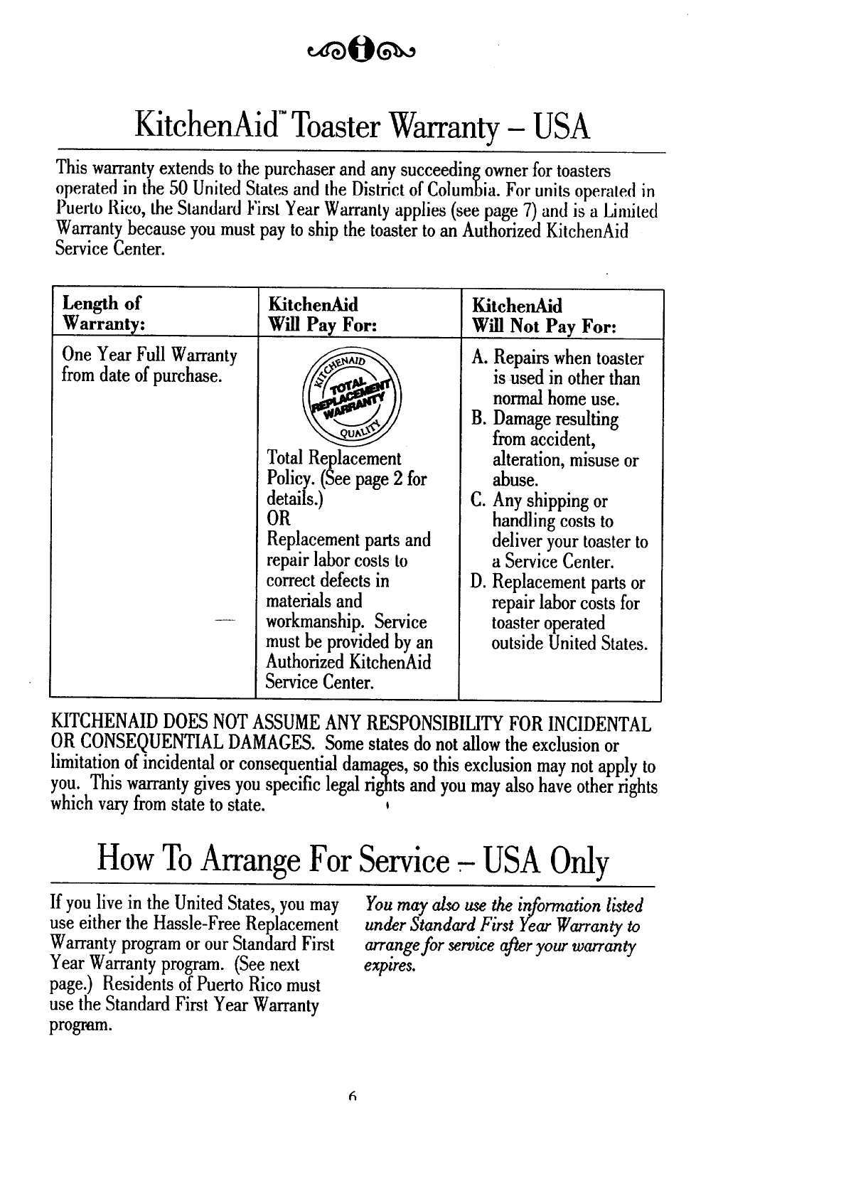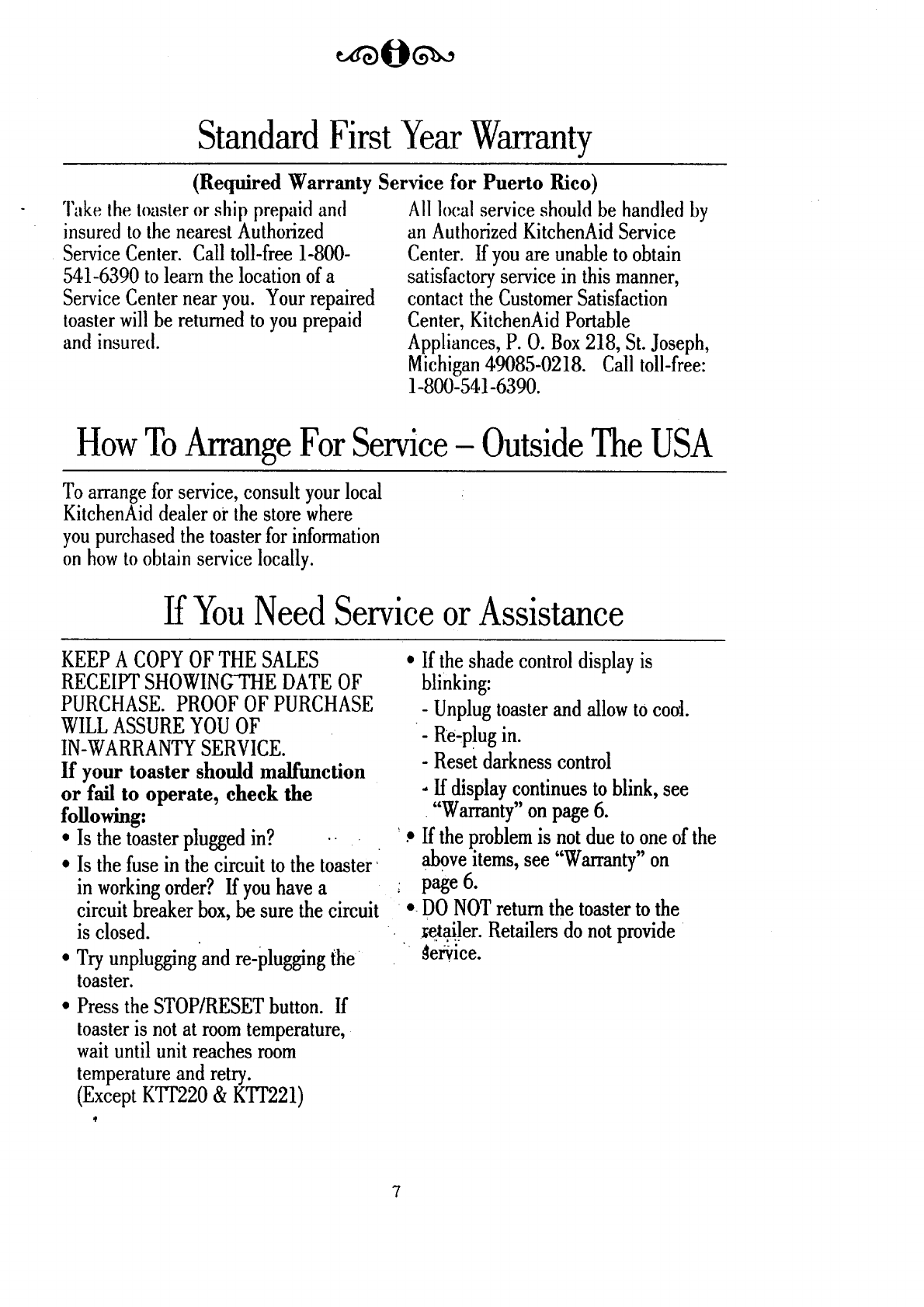 KitchenAid Toaster Warranty- USA