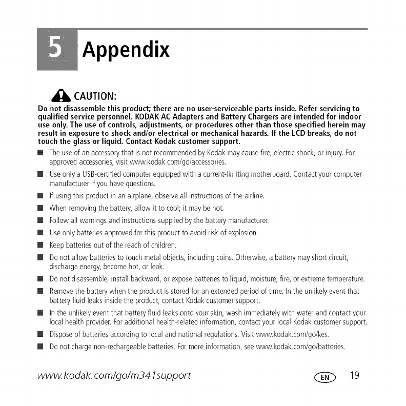 [] Theuseof an accessorythat isnot recommendedby Kodakmaycausefire, electricshock,or injury. For