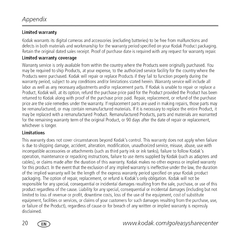 of the impliedwarrantywill be the length of the expresswarranty periodspecifiedon your Kodakproduct