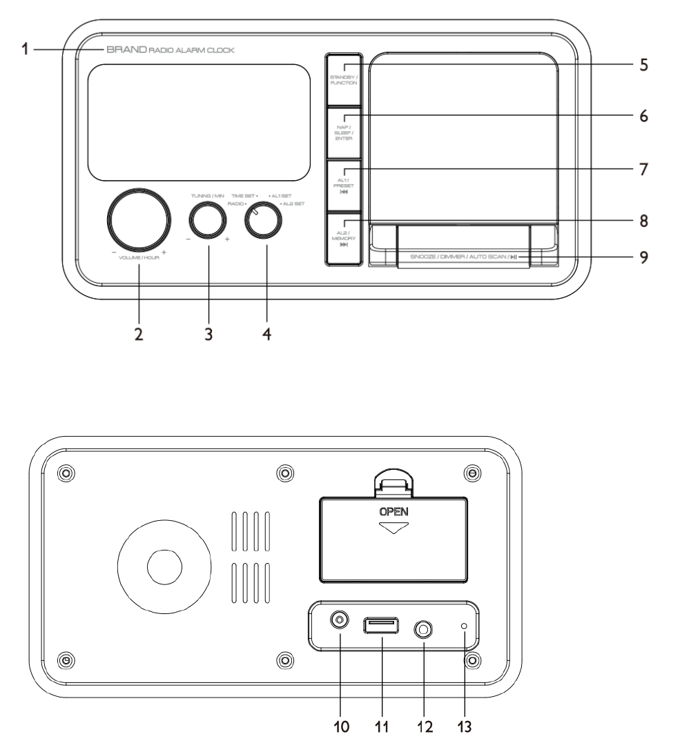2. VOLUME/HOUR 9. SNOOZE/DIMMER/AUTO