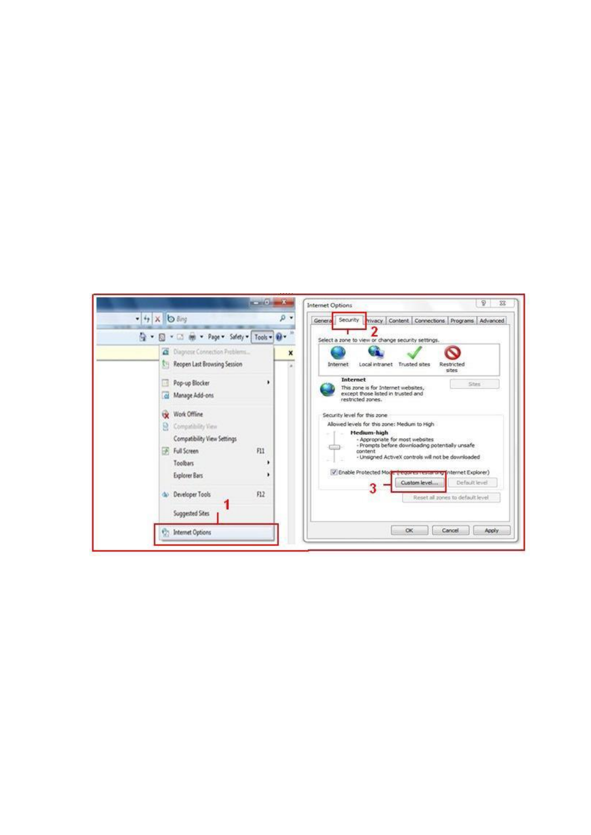 2.Change the ActiveX settings,“IE” browser > “Tool” > “Internet Options” > “Security”>