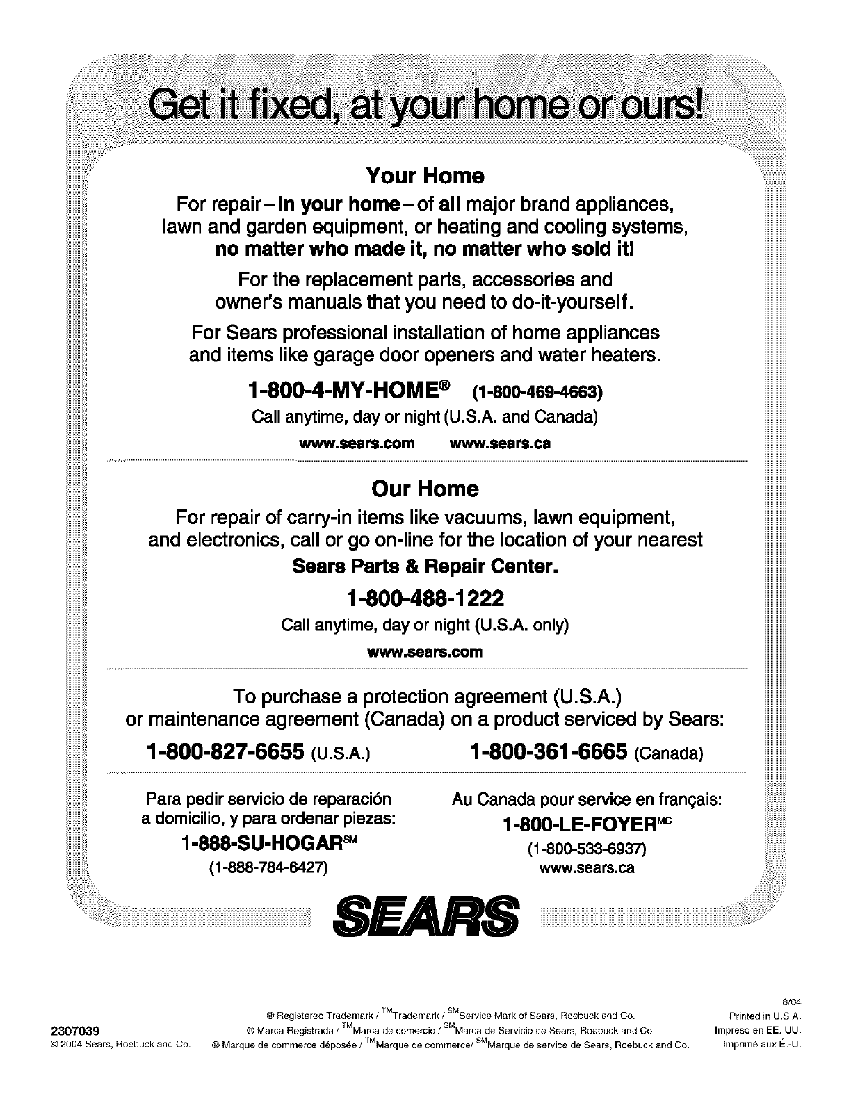 Sears Roebuck and Co., Hoffman Estates, IL 60179 U.S.A. www.sears.com