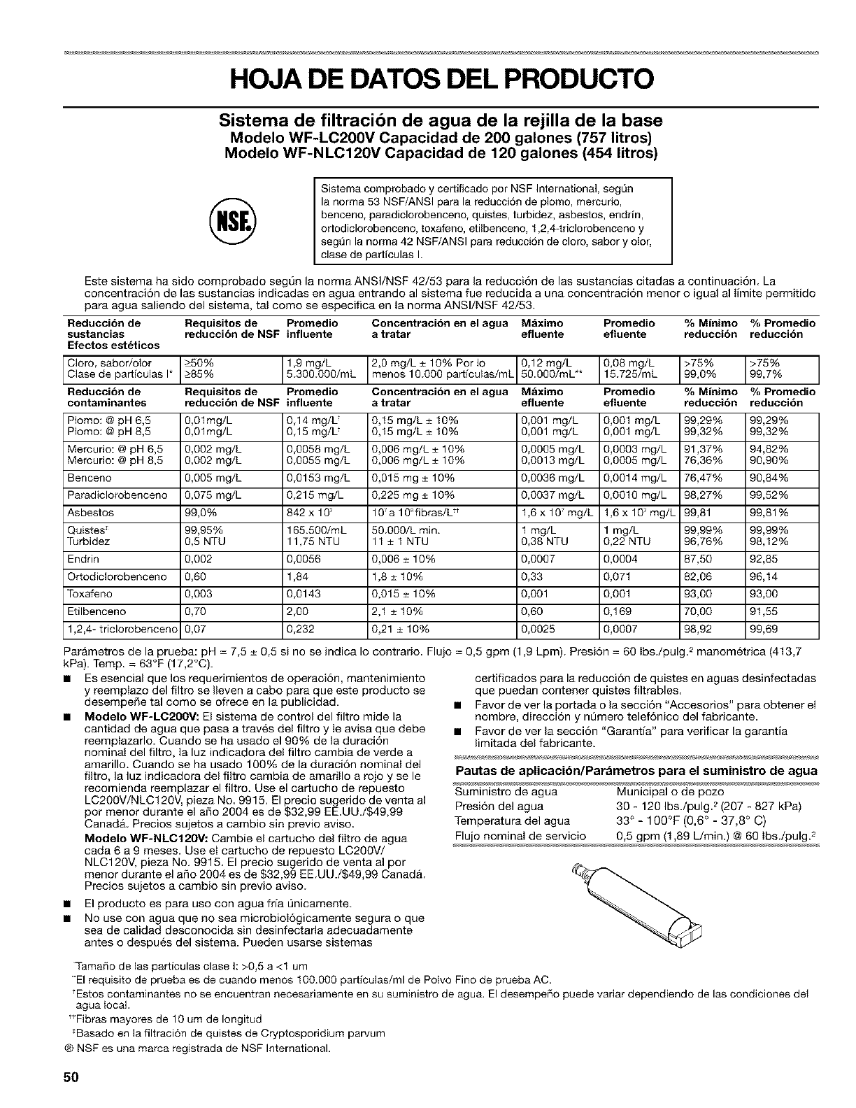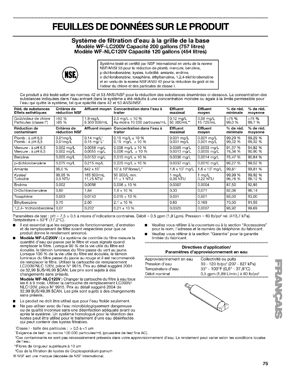 Param#tres de test : pH = 7,5 ± 0,5 & moins d'indications contraires Debit = 0,5 gpm (1,9 Lpm) Pression - 60 Ib/po 2 reL (413,7 kPa).