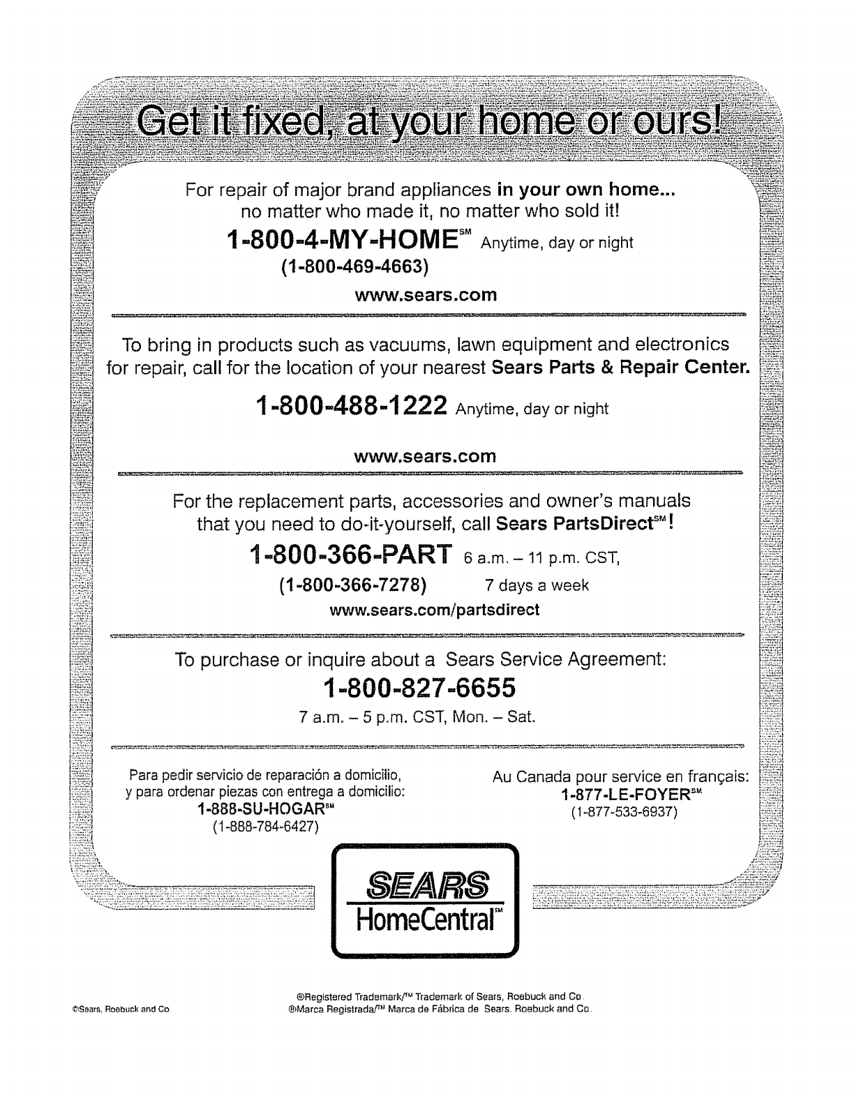 for repair, call for the location of your nearest Sears Parts & Repair Center.