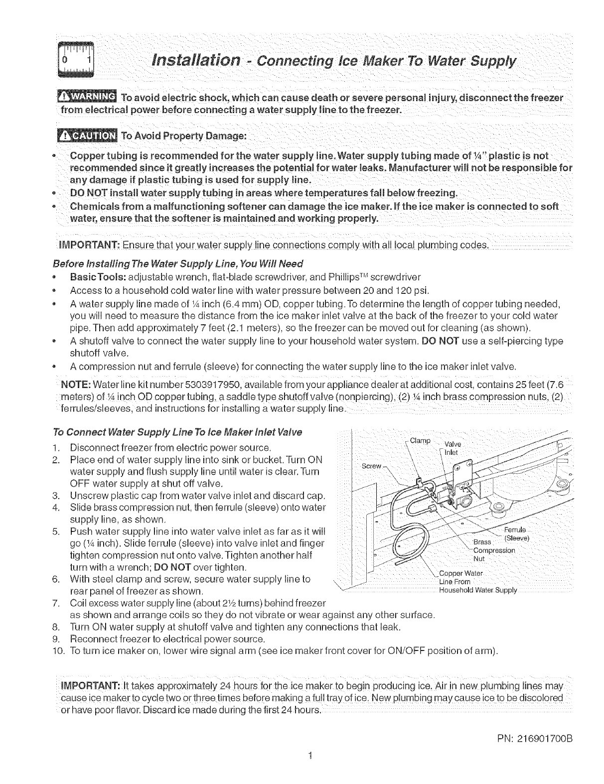 from electrical power before connecting a water supply line to the freezer.
