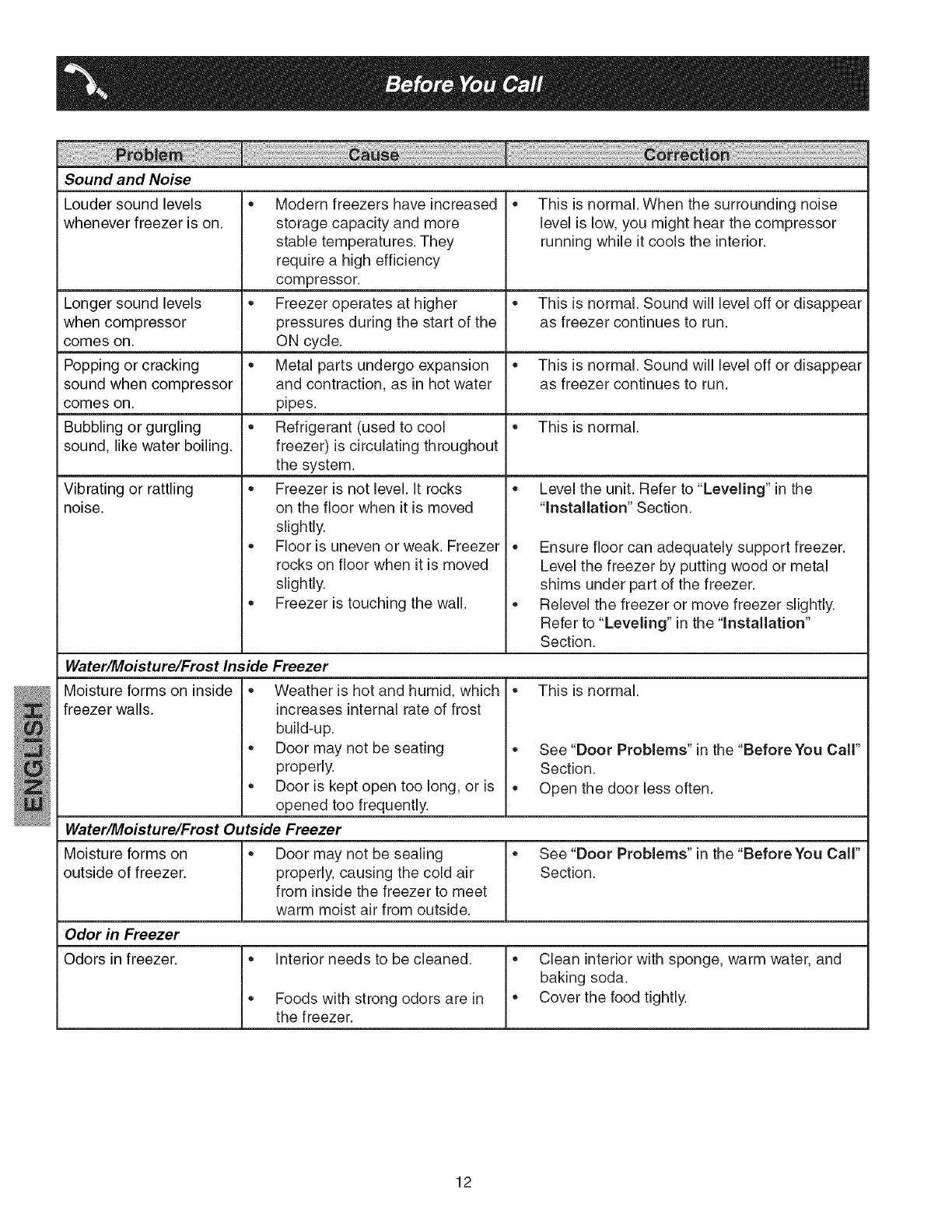 Odors in freezer. • Interior needs to be cleaned. ]-, Clean interior with sponge, warm water, and