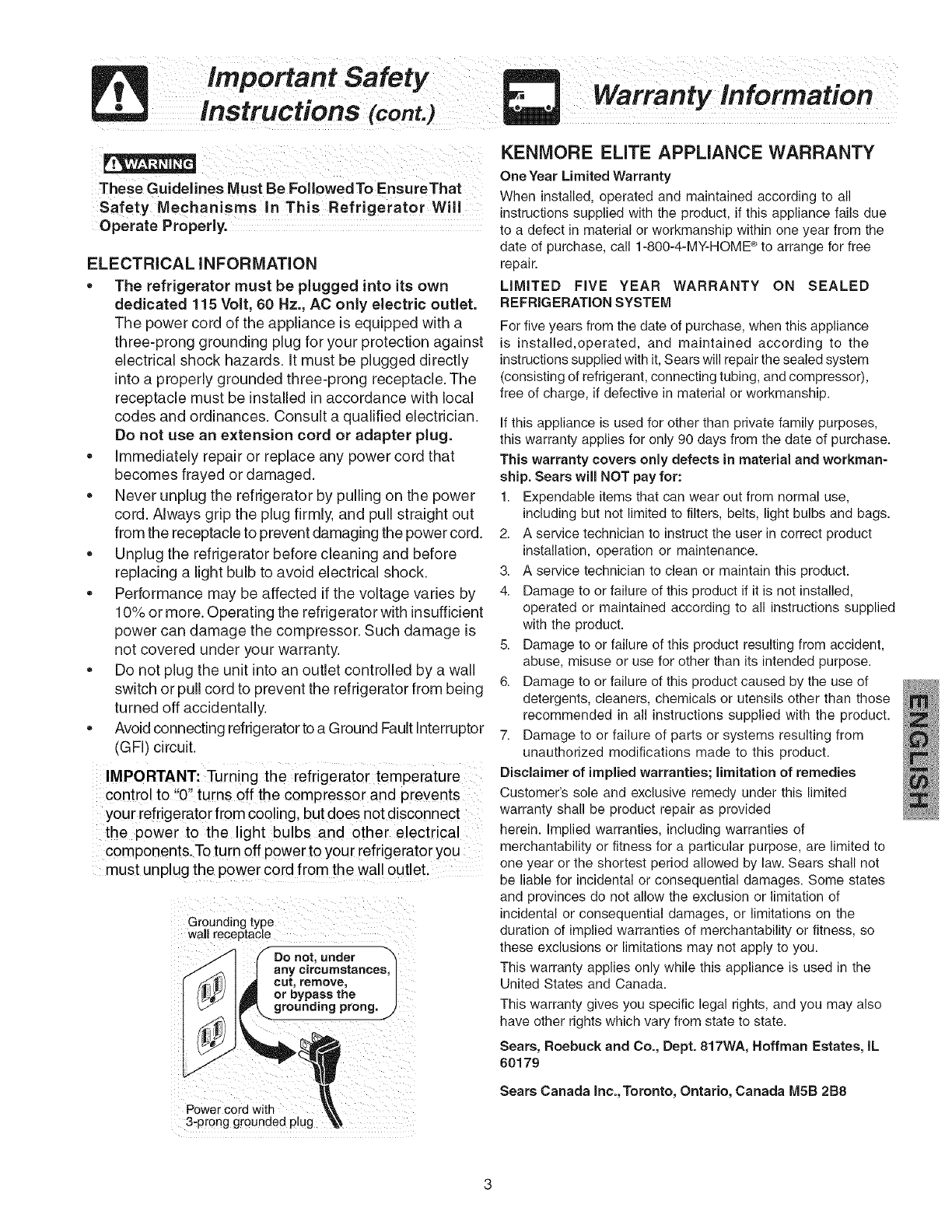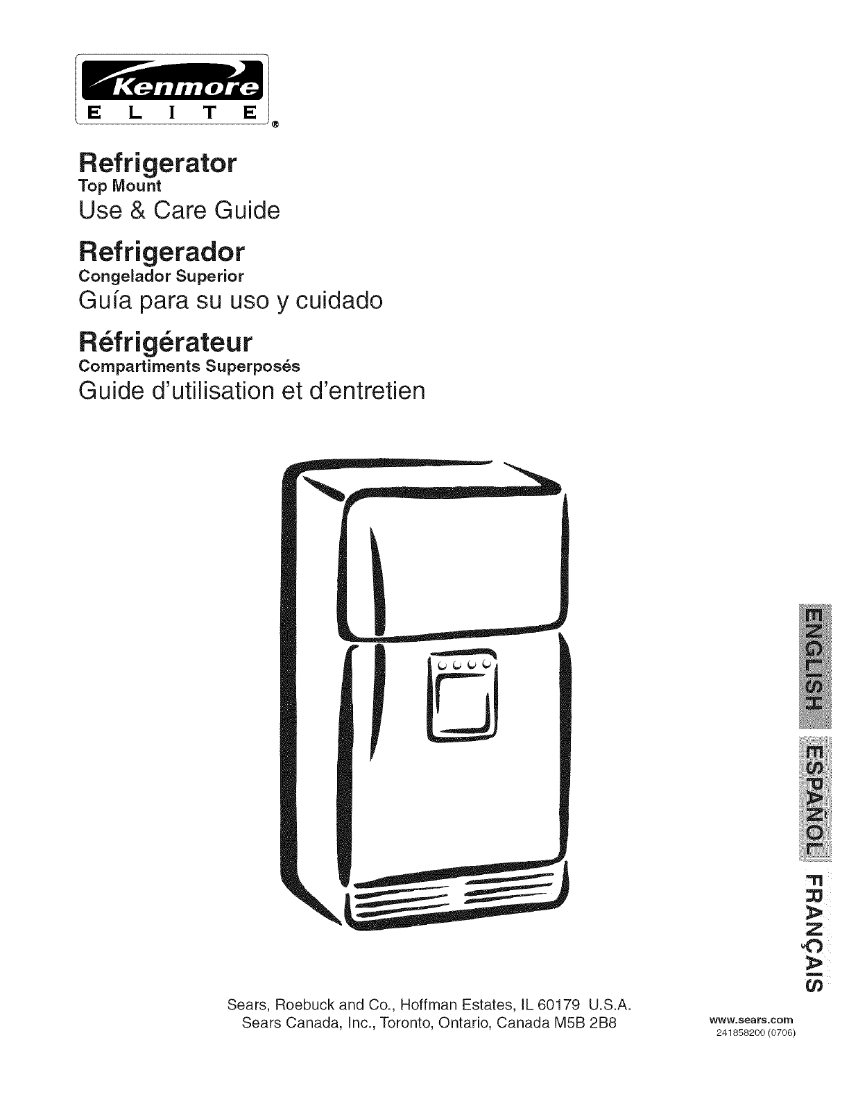 KENMORE ELITE Top Mount Refrigerator Manual L0711499 KENMORE ELITE Top Mount Refrigerator Owner's Manual, KENMORE ELITE Top Mount Refrigerator installation guides